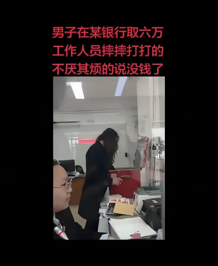 一男子去银行取六万块钱,银行工作人员拿钱时摔摔打打,不厌其烦说没钱了,看着很不情愿!搞的就是去要她钱一样!我取我自己的钱还要看你银行的脸色? 经常看到一些无脑,无理,无底线的事!让人不能理解!也没人管!