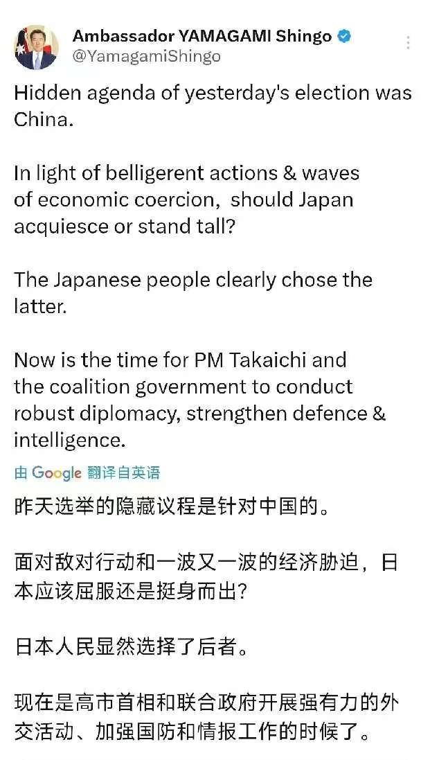 2月9日,日本驻澳大利亚大使山上信吾发文:“昨天选举的隐藏议程是针对中国的。面对敌对行动和一波又一波的经济胁迫,日本应该屈服还是挺身而出?日本人民显然选择了后者。现在是高市首相和联合政府开展强有力的外交活动,加强国防和情报工作的时候了。” [机智]日本驻澳大使山上信吾公然把选举绑上对华议题,还转发高市感谢特朗普的帖子,把外交体面抛到脑后。1972年中日联合声明明确以和平共处为基础,如今日方却不断背离共识。中国连续多年是日本最大贸易伙伴,双边贸易额超3500亿美元,经济深度捆绑。大使刻意渲染对立、鼓吹扩军情报,本质是配合右翼路线,迎合美国印太布局。把内政选举对外甩锅,既违背历史潮流,也损害日本自身利益,只会加剧地区紧张,挤压和平合作空间,得不偿失!