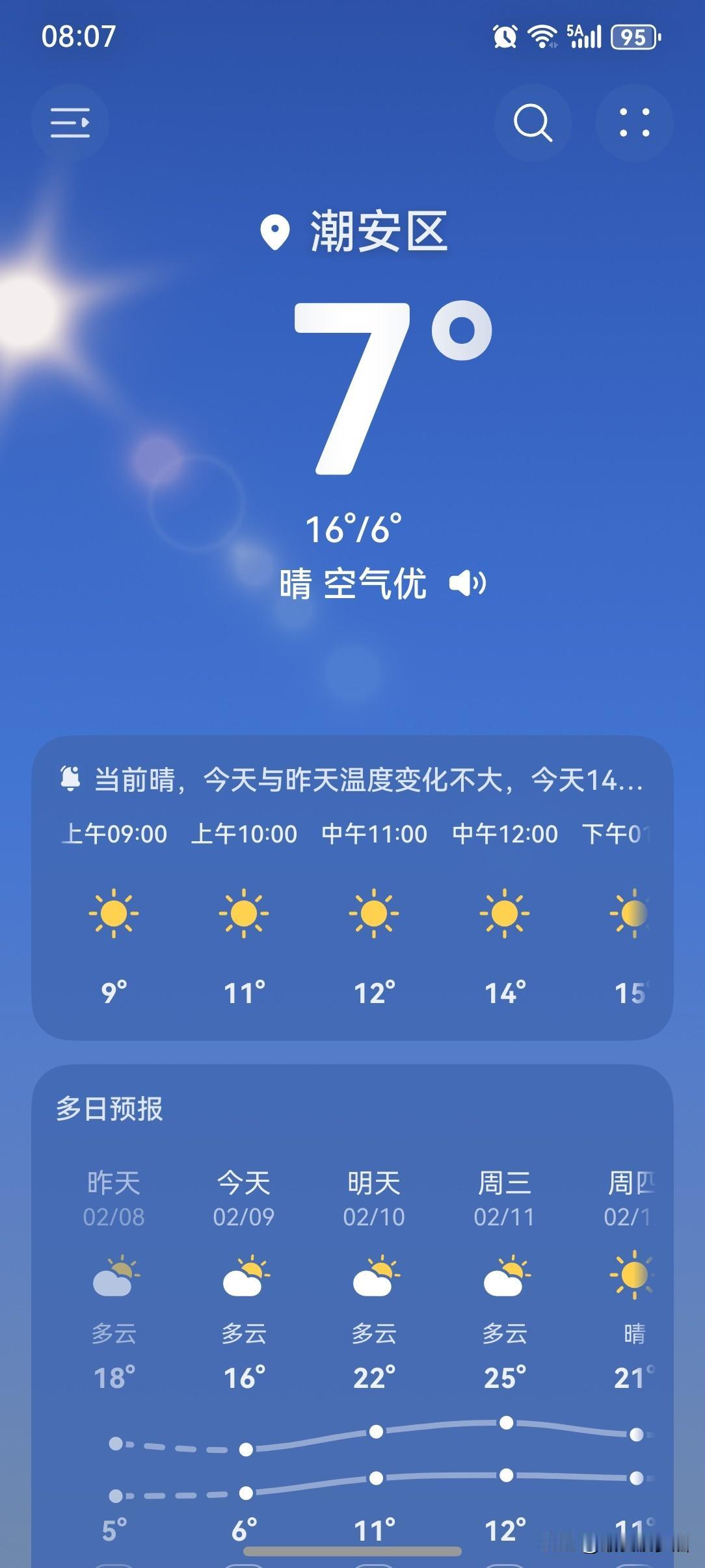 寒潮影响进入尾声北方将率先升温,9日起中东部大部进入升温通道,同时降水减弱! 广东今天(9日)早晨迎来本次降温过程最低气温时段,冰冻来袭,小伙伴们注意做好防寒保暖措施,千万别让感冒病毒有机可乘! 继续受冷空气影响,广东大部分市县过程最低气温出现在9日早晨,粤北部分市县有5°℃以下低温,高海拔山区1~3℃,局部有霜(冰)冻,广州过程最低气温10℃左右,10日起气温逐渐回升。 今天(9日),潮州喜提一个多云天气,气温6~16℃,此刻气温7℃,体感温度4℃。 早上是真的好冷啊!虽然太阳一大早就上线营业,但气温还是低迷,北风依旧猛烈。 一起来看看今天的天空吧!阳光灿烂且耀眼,但晒着太阳怎么感觉不到暖和呢? 天气寒冷,幸好今天出门做足的准备,里里外外裹得严严实实,密不透风,跟个粽子似的。当个粽子总比当孙子好吧?不想再被冻得跟孙子似的! 今天这天气该啊!怎么说呢?本来阳光灿烂的天气,应该是要好评的!但气温实在是太低了,冷冰冰的,好评不了一点啊! 如此天气!元芳,你怎么看? [捂脸][我想静静][大笑][笑哭][捂脸][我想静静][大笑][笑哭]