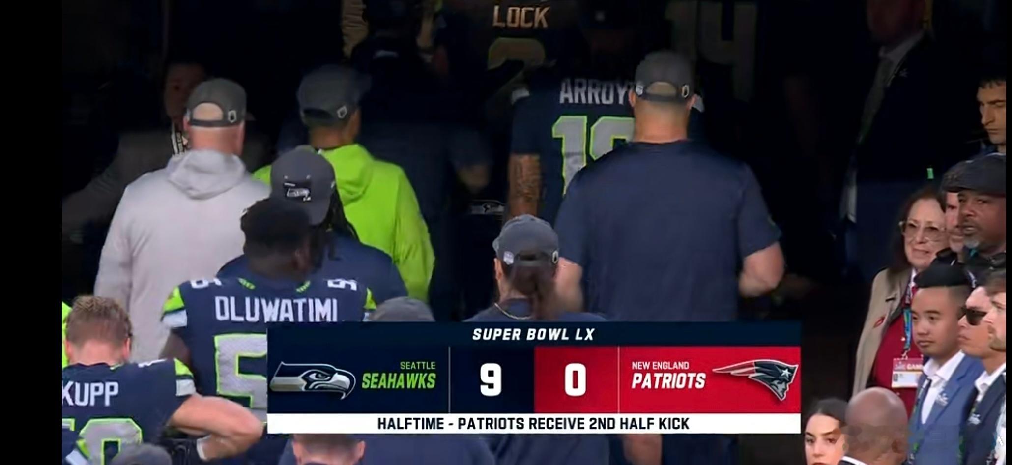 超级碗第60届超级碗比赛进行中,新英格兰爱国者队对决西雅图海鹰队。目前半场结束,海鹰队9-0爱国者队