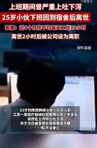 江苏无锡,一25岁男子下班回到宿舍后昏迷,抢救一周后离世,家人发现,男子离世2小时后,被公司设为离职,而且他生前4个月,每天都工作13小时左右,最高达14.8个小时,甚至累到嘴里渗血,家属认为男子是累死的,不能就这么算了,公司得给男子赔偿。 25岁的乐某,来自外地,大学毕业后进入无锡一家医疗器械科技有限公司工作。公司主营研发和生产,节奏快、任务重。 入职之初,乐某对这份工作充满期待,想着趁年轻多拼几年,攒点积蓄,未来好在城市站稳脚跟。可真正进入岗位后,他才发现现实远比想象中残酷。 公司实行的是“任务制”,并非固定下班时间。每天的工作量都会提前下达,如果任务没完成,无论多晚都不能下班。 起初,乐某还能勉强适应,但随着业务量增加,任务不断加码,加班逐渐成了常态。 根据家属后来整理的考勤记录和工作数据,乐某在去世前4个月里,几乎每天工作时长都在13小时左右,最长的一天甚至高达14.8个小时。 长时间的高强度工作,让他的身体逐渐亮起了红灯。 舍友回忆,乐某经常凌晨一两点才回宿舍,简单洗漱后倒头就睡,第二天一早又匆匆赶去上班。吃饭也极不规律,常常是泡面、外卖对付。 时间一久,他的脸色明显憔悴,整个人瘦了一圈。 同事也注意到他的状态越来越差。有几次在车间里,乐某突然捂着嘴跑去洗手间,出来时嘴角还残留着血迹。 他轻描淡写地说是“上火”“熬夜太多”,并未引起足够重视。公司内部,也并没有因为他的身体状况而调整工作安排。 事发当天,乐某一早就感觉不舒服。 上午开始,他出现明显的上吐下泻症状,脸色发白、浑身乏力。同事劝他请假去医院看看,但乐某担心任务完不成、影响考核,只是简单吃了点药,坚持继续工作。 周围的人也以为他是吃坏了肚子,没想到事情会这么严重。 当天晚上,完成工作后,乐某拖着疲惫的身体回到宿舍。舍友外出未归,房间里只有他一个人。 第二天早上,舍友发现乐某迟迟没有起床,叫了几声无人回应,推门进去才发现他已经昏迷不醒。情况紧急,大家立刻拨打了急救电话,将他送往医院。 医院诊断结果令人震惊——外伤性脑部损伤。医生表示,患者送来时情况已经十分危急,虽然立刻展开抢救,但脑部损伤严重,伴随多项并发症。 乐某在重症监护室里躺了一周,始终没有恢复意识。最终,家属还是等来了最不愿意面对的消息:抢救无效,宣告离世。 更让家属难以接受的是,在乐某离世仅2小时后,公司系统里便显示其“已离职”。这一操作,让家属情绪彻底崩溃。 他们认为,在员工生死未明、甚至刚刚去世的情况下,公司如此迅速地“切割关系”,显得冷漠而无情。 整理遗物时,家属发现了更多令人心痛的细节。乐某的手机里,记录着密密麻麻的工作日志、任务提醒和加班记录;聊天记录中,多次出现他向朋友抱怨“太累了” “真有点扛不住”的话语。还有几段语音,是他深夜发给家人的,却又迅速撤回,似乎不想让父母担心。 家属认为,乐某长期超负荷工作,身体早已处于极限状态,这次突发状况绝非偶然。 “孩子才25岁,没有基础疾病,怎么会突然就这样走了?”在他们看来,长期高强度加班,是压垮他的最后一根稻草。 随后,家属向有关部门反映情况,要求公司给出合理解释和赔偿。 他们认为,无论最终医学鉴定结果如何,公司在用工管理、工作时长控制、员工健康保障等方面,都存在明显问题,不能一句“个人原因”就推卸责任。 事件曝光后,网友们议论纷纷。有人为年轻生命的逝去感到惋惜,有人质疑“以命换钱”的加班文化,也有人呼吁企业正视员工健康,不要再用“拼命”作为衡量价值的标准。 截至目前,相关部门已介入调查,事件仍在进一步处理中。而乐某的家人,只希望事情能有一个公正的结果,让逝去的年轻生命,不至于悄无声息地被时间掩埋。