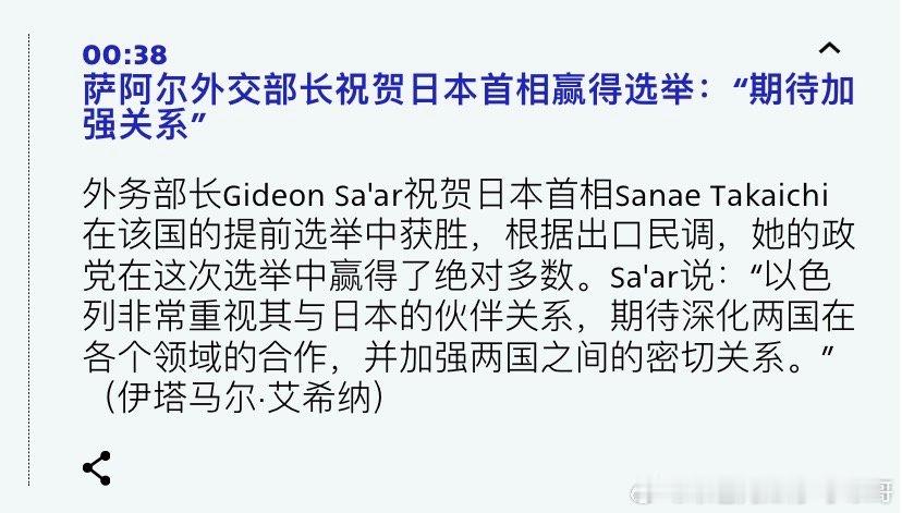 祝贺以色列外长祝贺高市早苗赢得选举,表达希望加强以色列和日本伙伴关系的愿望。海外新鲜事