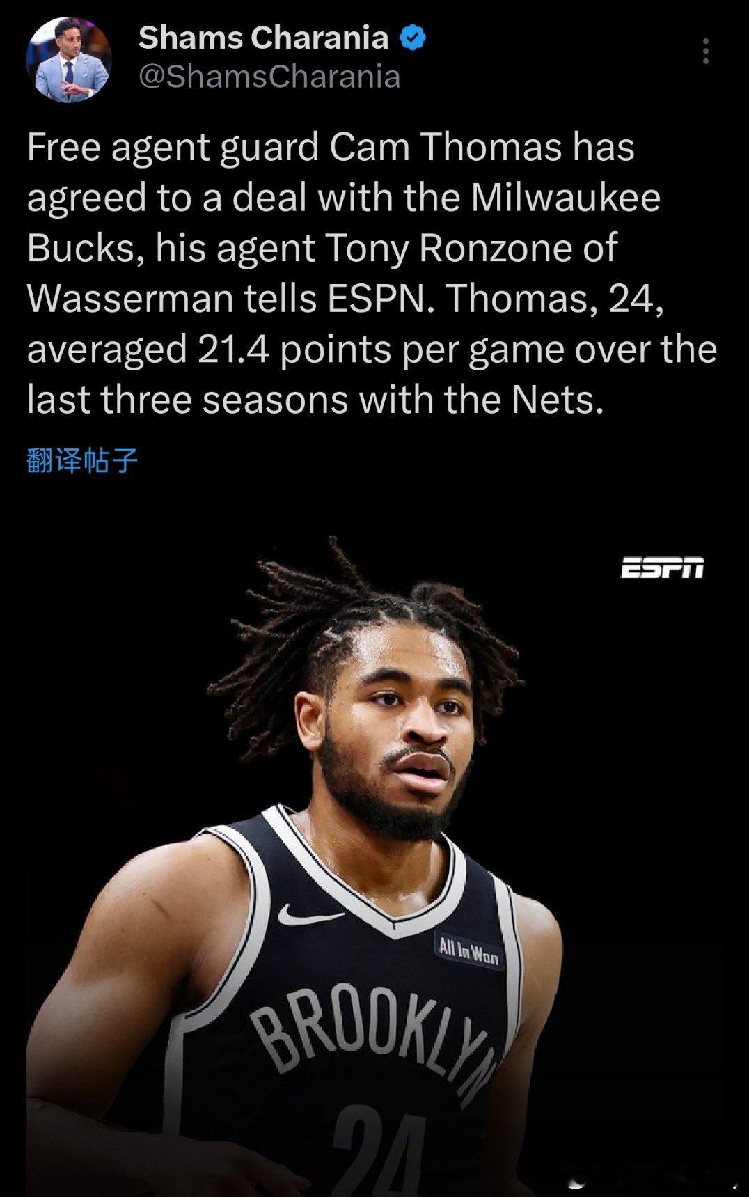 买断市场!卡姆·托马斯签约雄鹿。24岁的托马斯过去三个赛季效力于篮网队,场均得到