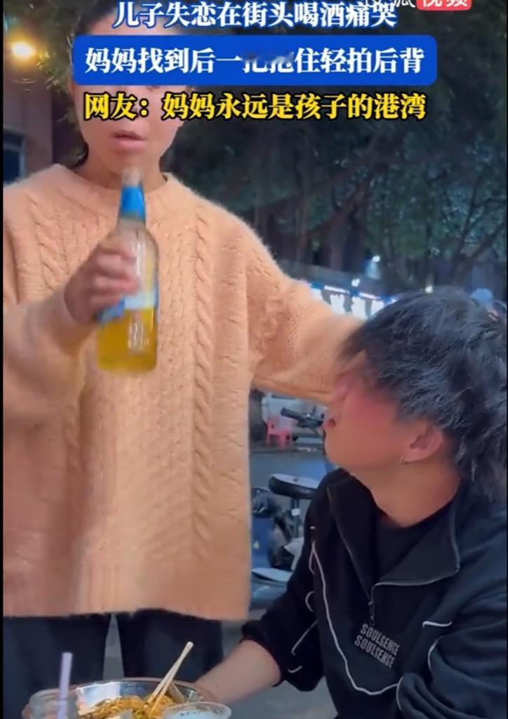 泪目了,一小伙失恋后在街头买醉,而就在小伙黯然神伤的喝酒哭泣时,小伙的妈妈却悄悄的来到了小伙身后。此时的妈妈没有责备小伙,也没有安慰小伙,而是温柔的摸了摸小伙的头,然后给小伙倒上一杯,自己则拿起酒瓶喝了一大口,仿佛通过这个动作,表达了此时此刻母亲对孩子内心感受的理解。 没有一句大道理,没有一句“别哭了”,更没有劈头盖脸的“没出息”,这位妈妈只用一个摸头、一杯酒、一口闷,就接住了成年儿子所有的崩溃与狼狈。 我们总以为,成年人的难过要藏起来,失恋的狼狈要躲起来,连哭都要挑夜深人静的角落,怕被人看见,怕被说脆弱,怕被指责“这点事都扛不住”。可在妈妈眼里,你永远是那个受了委屈就可以哭、摔了跤就可以疼的孩子,无关年龄,无关体面,只关乎你痛不痛、难不难过。 很多人说,失恋而已,至于在街头买醉吗?至于哭到失控吗?可只有经历过的人才懂,那不是一杯酒,是攒了很久的委屈,是掏心掏肺后落空的真心,是以为会走到最后却突然散场的遗憾。我们在爱情里拼尽全力,最后却输得一塌糊涂,连体面都守不住,那种无助,真的会让人瞬间垮掉。 而最戳心的,从来不是妈妈陪他喝酒,而是她不劝、不骂、不指责的懂得。她知道,此刻的大道理比刀子还伤人,此刻的安慰比沉默还苍白,她唯一能做的,就是站在他身后,告诉他:你可以哭,可以痛,可以不坚强,妈妈陪着你,你的狼狈,我全盘接纳。 这世上最温柔的力量,从来不是“我教你怎么做”,而是“我懂你的难”。我们长大以后,习惯了报喜不报忧,习惯了硬撑着说“我没事”,可在妈妈面前,所有的伪装都会瞬间崩塌。她见过你最光鲜的样子,也接纳你最落魄的时刻,她不问你为什么难过,只默默陪你扛下所有情绪。 有人看完视频说:破防了,长这么大,只有我妈会这样包容我的所有不堪。也有人说:原来最好的爱,是不追问、不指责,是默默陪伴。 其实人生本就充满遗憾,失恋也好,失意也罢,谁都有撑不住的瞬间。但请记得,无论你走多远、摔多惨,总有一个人,会无条件站在你身后,不问缘由,只护你周全。 这一杯酒,喝的不是醉,是妈妈的心疼;这一个摸头,抚的不是头发,是孩子的伤痕。愿我们都能在崩溃时,有这样一个人接住我们;也愿我们,永远珍惜那个无条件爱我们的人。喝酒男人的眼泪 对待失恋的态度 #