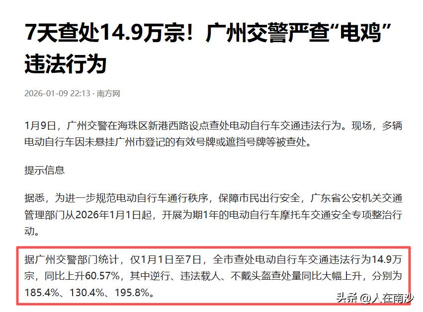 【广州电鸡整治又双叒升级!这次直接进村了】广州电鸡整治又双叒升级!根据媒体报道,最近白云瑶台、三元里等城中村,执法人员进村穿巷抓违规电鸡,天河猎德等住宅区违规电鸡成批被拖走。 此前广州电鸡整治,主要集中在大马路、商圈、地铁站等人流密集公共场所,以路面巡控为主。而这一轮整治全面下沉、精准加码。城中村、背街小巷,曾经违规电鸡的“避风港”,如今告别管控盲区。白云瑶台、三元里一带,官方多次通报联合街道、联社入村清理违停、无牌电鸡,现场成批拖移、集中存放。 除了城中村的全方位清查,住宅区、产业园区的整治力度也同步拉满。天河猎德等重点管控区域,近期新增抓拍点位;东圃创意园等产业园区同步升级为常态化严管卡点。 全市已形成统一标准,无牌、假牌、改装、违停堵路、占用消防通道,一律可拖移暂扣。 根据介绍2026年1月1日至7日,仅7天就查处各类电鸡违法14.9万宗。而对比起来2025年5月到12月,才累计查扣涉牌电鸡16.3万辆。也就是说今年7天就等于上一年几个月的量了。 感觉接下来可以继续加大力度,直接进入小区楼盘查电鸡了,基本上架空层等停车都是属于不合法的,一查一个准。