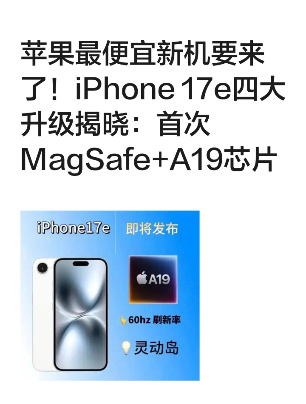苹果最便宜新机要来了苹果可能会在2月19日(周四)通过新闻稿的形式发布iPhone 17e。预计搭载 A19处理器+苹果自研的C1X基带,屏幕还是 6.1英寸+60Hz 刷新率的组合。至于正面是刘海屏还是灵动岛,现在还不太确定,大部分爆料都说是灵动岛。另外,17e 还终于支持了MagSafe 磁吸无线充电,最高支持25W 满血。上一代的发售价是4499元,并且支持国补,补贴后到手价 3999元。这一代大概率会维持原价不变。