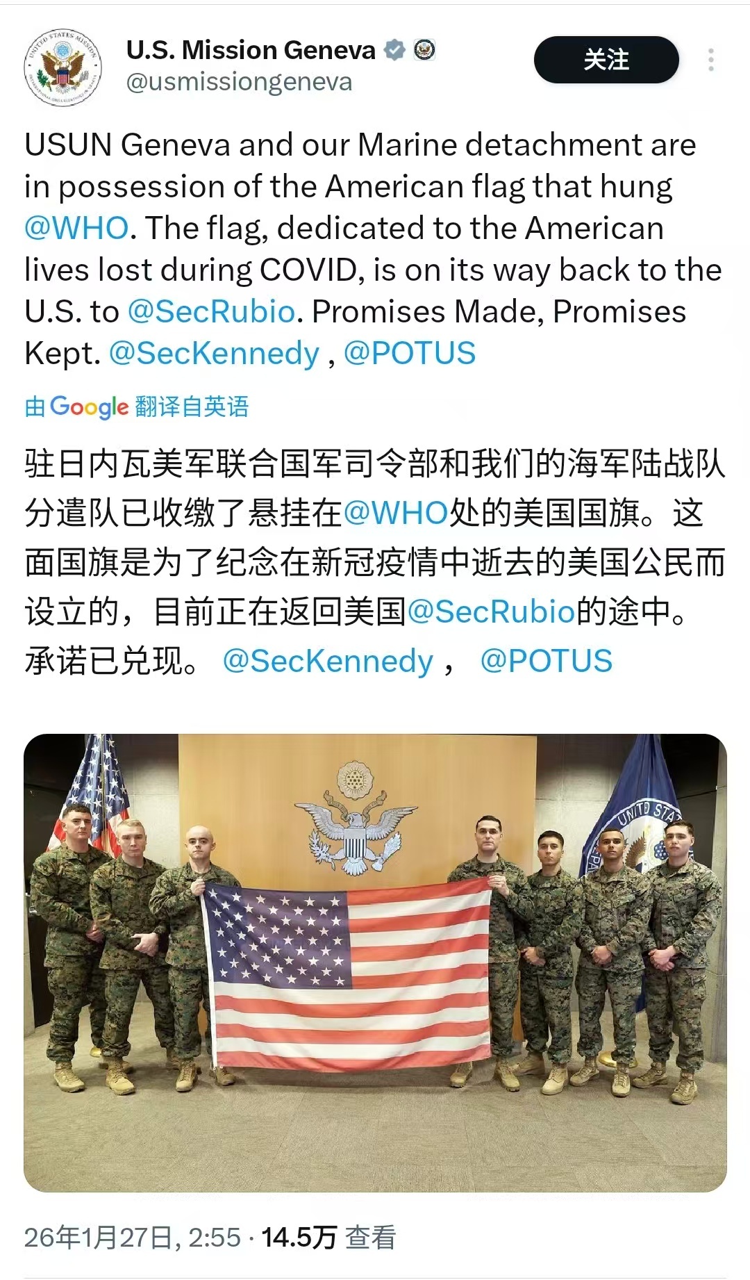 四天后,美国驻日内瓦使团高调宣布,美国海军陆战队已从世卫总部抢了美国国旗,正运回美国途中。