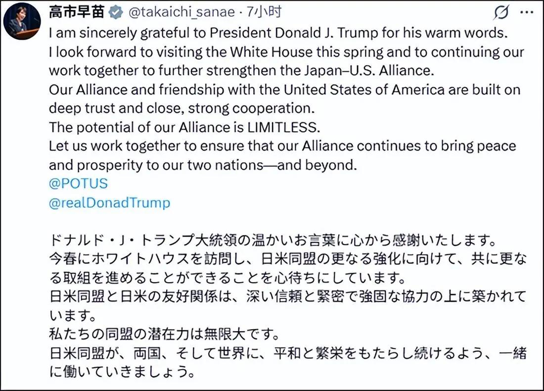 高市早苗发文感谢川普的支持,川普的口号是让美国再次伟大,高市早苗的口号是让日本回归正常国家。这两个人的结合,值得关注,并警惕!