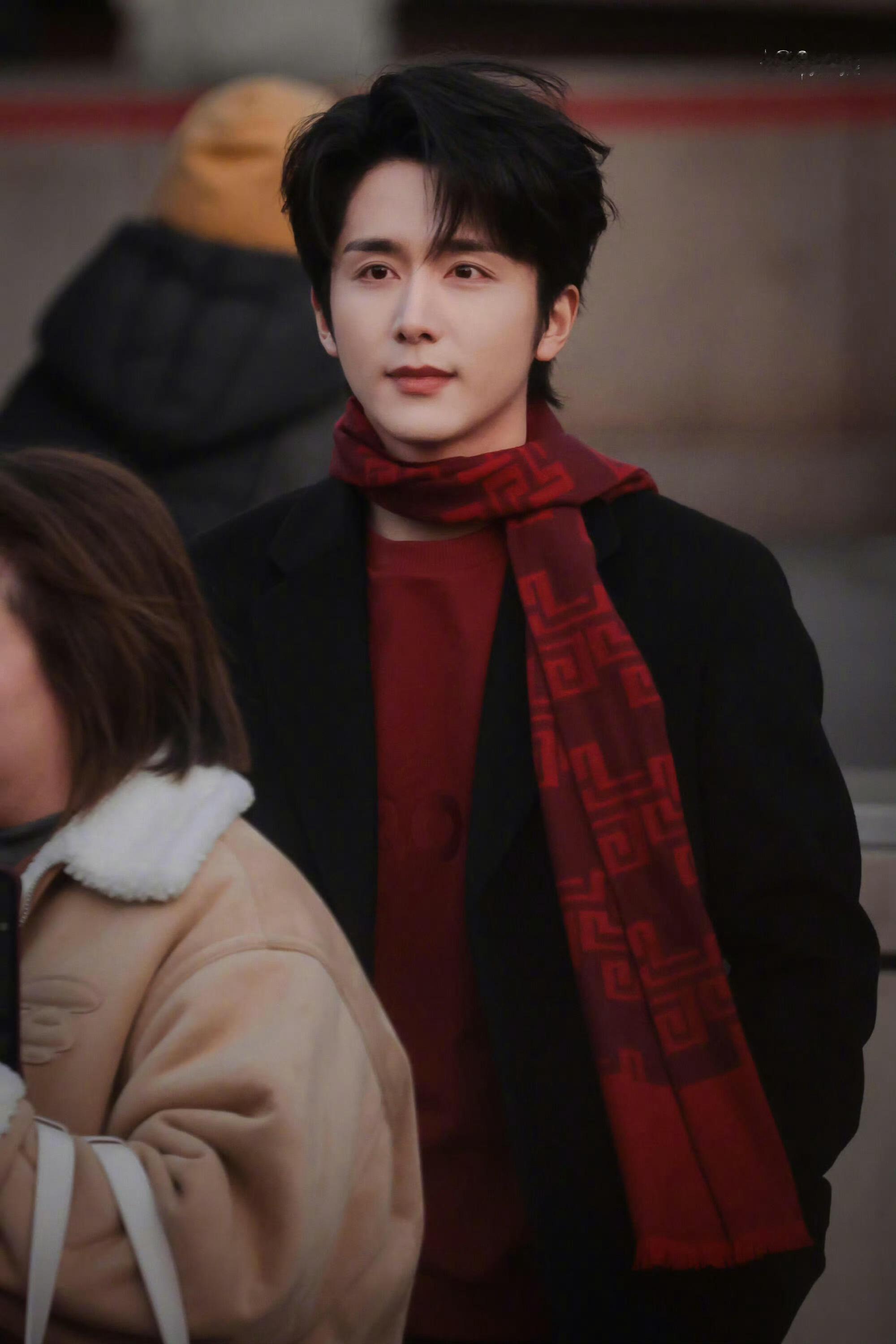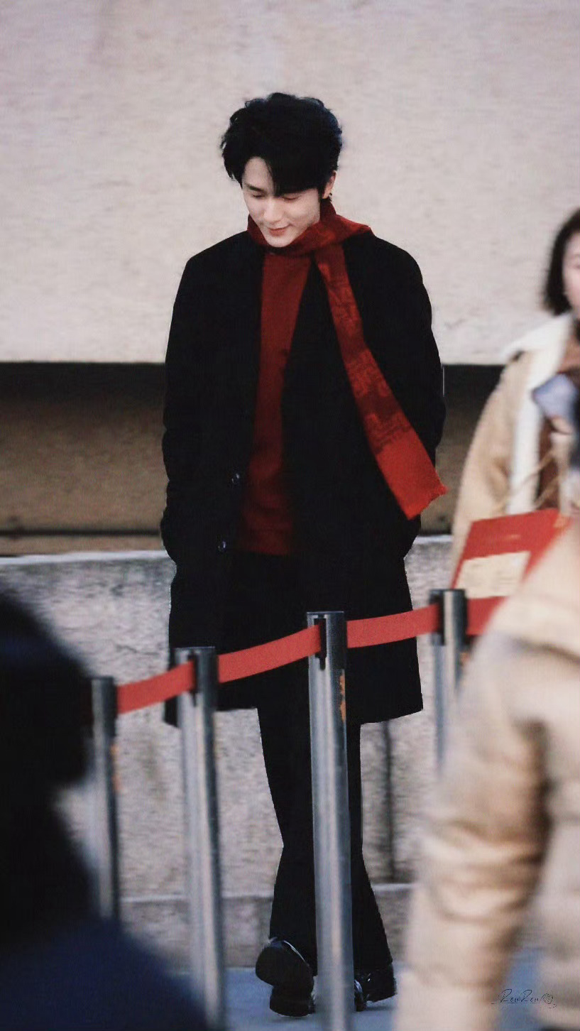 张新成在央视门口出片了黑色大衣,红色围巾,一道靓丽的冬日风景,张新成在央视门口