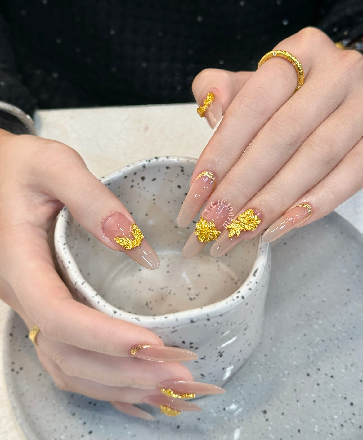黄金黄金美甲不仅金价疯,对于金饰的开发更疯,现在连黄金甲片都可以选款式了,一伸