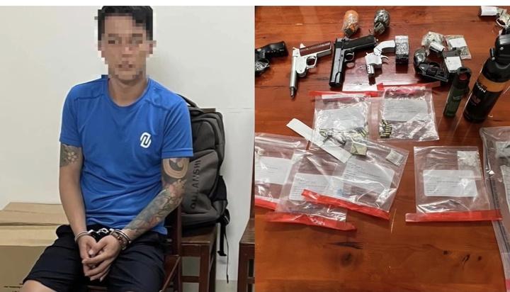 越南广义省广义市警察局侦查局在毒贩家里没收了各类枪支8支、铅弹和球弹570多发、手榴弹形状的金属圆球2个、胡椒喷雾罐2个、刀具9把、砍刀、装有白色晶体的塑料袋3个(承认对象为毒品)。