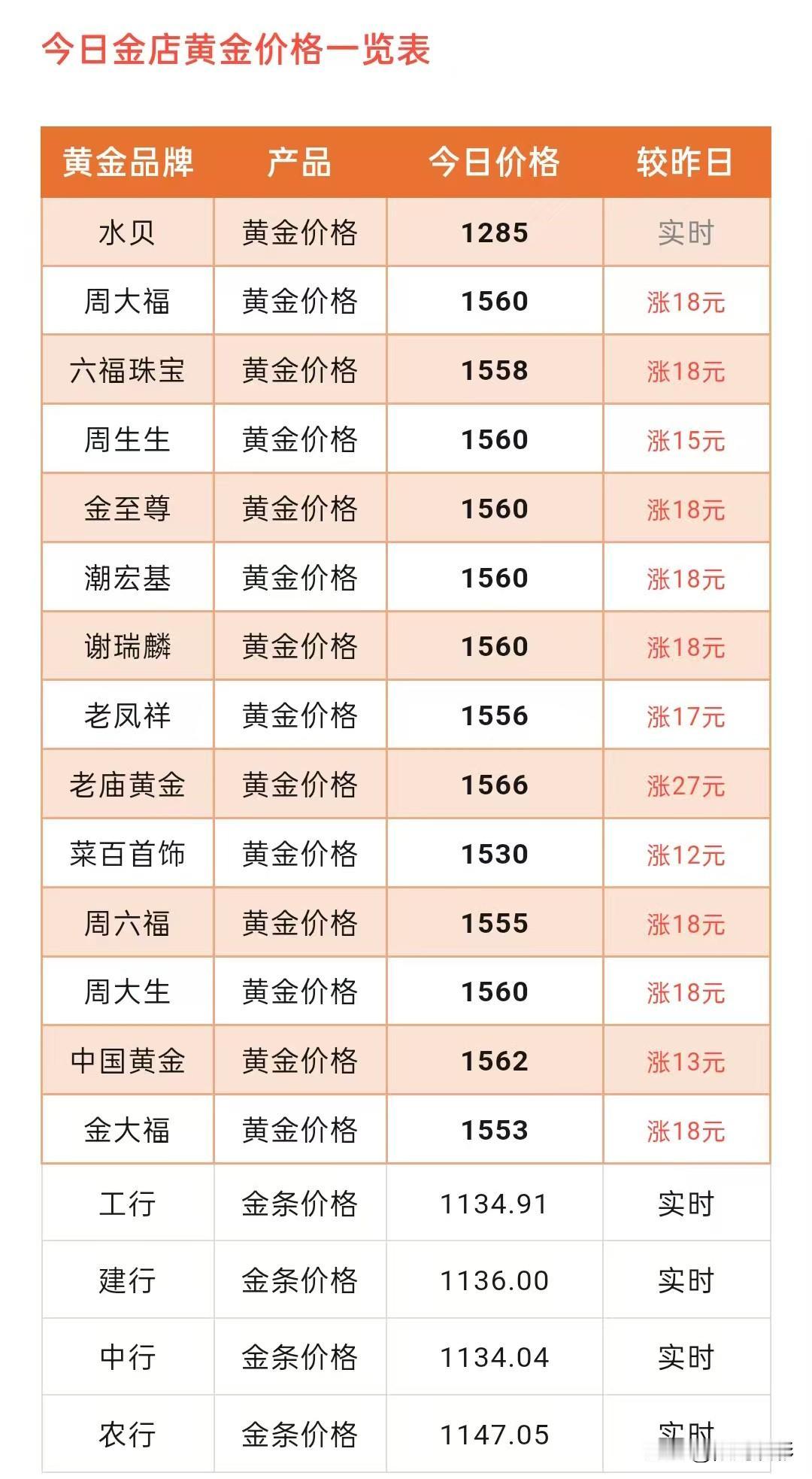 今日金价!金饰品克价上涨了! 那么来看看,今天各地品牌黄金门店金饰品价格多少钱一克了? 周大福黄金价格1560元/克,六福珠宝黄金价格1558元/克,周生生黄金价格1560元/克,老凤祥黄金价格1556元/克,老庙黄金黄金价格1566元/克,菜百首饰黄金价格1530元/克。 同昨天各大黄金门店金饰品价格相比较,今天各门店金饰品价格都整体上涨了。 周大福、六福珠宝、金至尊、潮宏基、谢瑞麟、周六福、周大生、金大福各上涨了18元/克,周生生上涨了15元/克,中国黄金上涨了13元/克,菜百首饰上涨了12元/克,老凤祥上涨了17元/克,老庙黄金上涨了27元/克。 据黄金价格网消息:2026年2月9日,黄金白银延续涨势,黄金重回5000美元关口,白银重回80美元关口。 截至11时07分黄金实时行情:伦敦现货黄金报每盎司5016美元,美黄金报每盎司5037美元,伦敦现货白银报每盎司80.8美元,美白银报每盎司80.6美元。国内实时金价1119.5元/克,白银实时价格19.6元/克,铂金实时价格476.3元/克。 消息面上:美伊局势再度紧张,美国总统特朗普对与伊朗有贸易往来的国家征收关税。美国旧金山联储主席玛丽·戴利最新表示,她认为可能还需要进行一次或两次降息操作,以应对劳动力市场的疲软状况。 再来分享个购买黄金饰品注意5要点,买金不踩坑。 1: 不必执着大品牌。足金首饰不一定非选大品牌,只要是足金小品牌或普通金店也可以,款式差异不大,还能省不少钱,毕竟大品牌金价和工费偏高。 2: 认准足金标识。买的时候别只看款式,一定要看钢印标有AU 999、G999和足金999的才是足金指标,不用追求4个9、5个9的纯度,回收时和3个九的价格一样。 3: 按克购买更划算。黄金要按克卖,别买一口价,单价高,后续货款只能换一口价款式,可能还要补钱,再优惠也不划算。 4: 慎选带附加饰品的款式。带玉石、珍珠、钻石的黄金款式尽量不买,这些附加饰品容易掉且不值钱,金价可能拉高,专坑不懂行的。 另外,耳钉选弯针不选直针,项链选M扣不选弹簧扣,手镯不选搭扣款和镂空开口款,这些非足金部分也会按足金计价。 5: 提前了解实时金价,上网查一下黄金走势,各品牌和银行的当日金价,做到心里有底。 还有,金店可以砍价,店员可能有内部优惠或员工折扣,你得主动提出要求,不然他们不会主动说,毕竟多买多赚。 记住这几点,买黄金首饰就不会吃亏。 再来分享个黄金首饰保存的方法: 1: 单独存放:用首饰盒里的小格子或独立密封袋分开装,避免和其他饰品摩擦,也能防潮湿。 2: 环境干燥:别放在浴室、厨房等潮湿地方,可在首饰盒里放一小包干燥剂,防止黄金氧化受潮。 3: 长期不戴:先用软布擦干净再存放,避免表面留汗渍或污垢,否则放久了可能暗沉。另外,如果发现黄金表面有轻微发黑,别自己用硬物刮,先试试温和清洁,要是氧化严重或有磨损,直接找品牌售后,他们有专业翻新服务,能恢复光泽。 最后教大家一个小技巧,如果想保护黄金首饰的光泽,可以在买来之后薄薄涂上一层透明指甲油,这样它的光泽度就会维持的更加自久了。 以上,所有信息,都只是提供参考价值! 购买黄金有风险,投资需要谨慎,不要盲目跟风! 黄金售卖价格 黄金一克720 黄金金店价格 足金金饰价格 黄金价格680 周生生的金价 金饰价