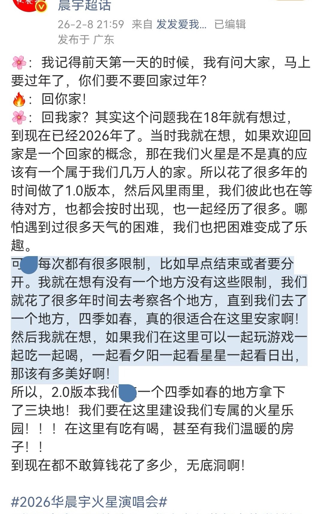 我嘞个豆?!华晨宇在巡演深圳收官站宣布重磅消息,乐园形式的演唱会升级2.0后,不再是租地而是拿下三块地!“以前乐园是找一个地方租一块地,从零开始做基建搭舞台,那2.0是在一个四季如春的地方,拿下了三块地!那里有我们的乌托邦,还有演唱会,有吃有喝有玩,还有温暖的房子”。乐园2.0我必去看!娱乐圈说宠粉的华晨宇说第二没人敢称第一