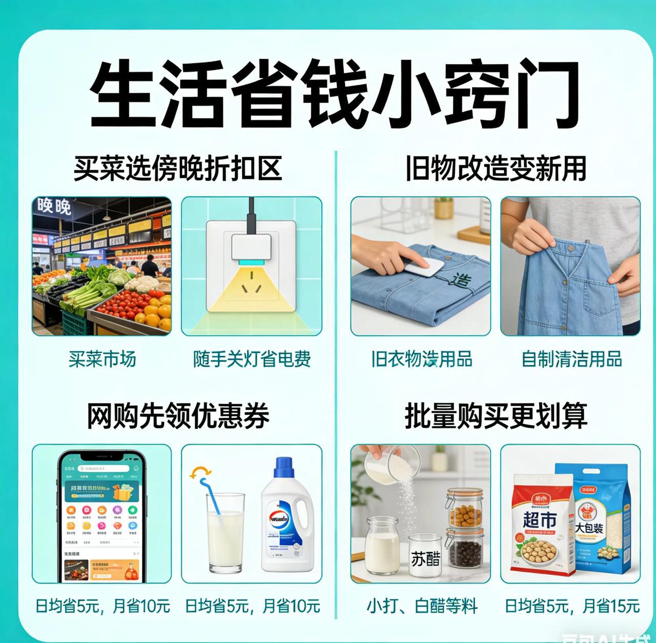 省钱是门学问,我来分享些实用方法。 穿衣上,精简衣橱,选基础款,研究穿搭实现“一衣多穿”。饮食方面,告别饮料、零食和外卖,自己做饭,吃完冰箱存货再买。居住时,不买非刚需小家电,爱惜物品,旧衣变废为宝,还能收集热水器凉水冲厕。出行少逛街,选公共交通,避开节假日国内游,不买景点 购物时控制欲望,不跟风囤货,列清单购物,少逛平台和种草视频。另外,别花冤枉钱,耳朵有自洁功能,别买高端掏耳勺;缓解眼疲劳,热毛巾热敷就行;补充维生素,别听店员推荐贵的保健品。 省钱抠门小技巧