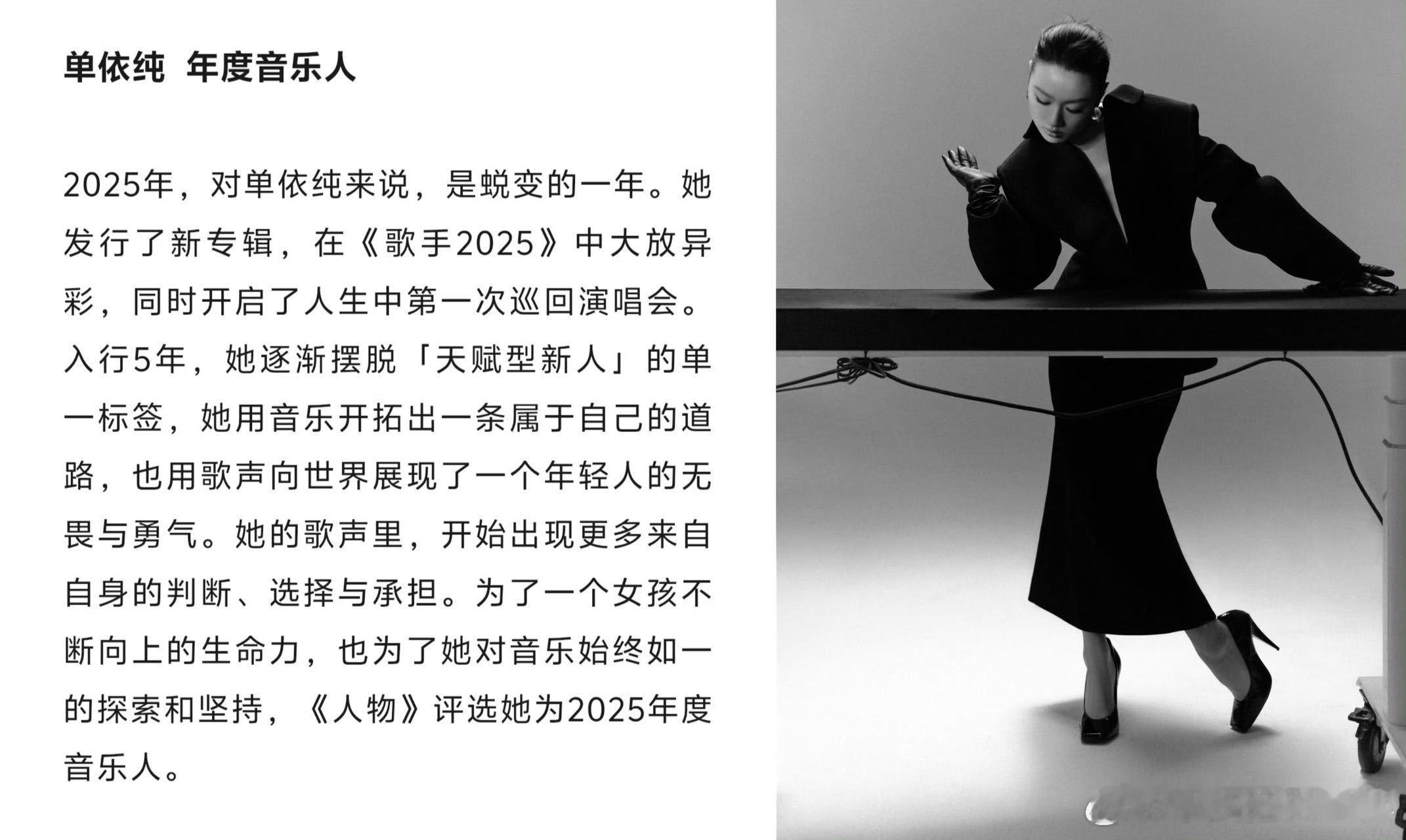 单依纯年度音乐人单依纯入选2025年度面孔 哇哦!成为《人物》2025年度音乐人啦!五年间,她凭借出色唱功和独特音乐风格,在乐坛站稳脚跟。入选年度面孔更是对她努力的肯定。2026,期待她继续发光,为我们带来更多经典之作!