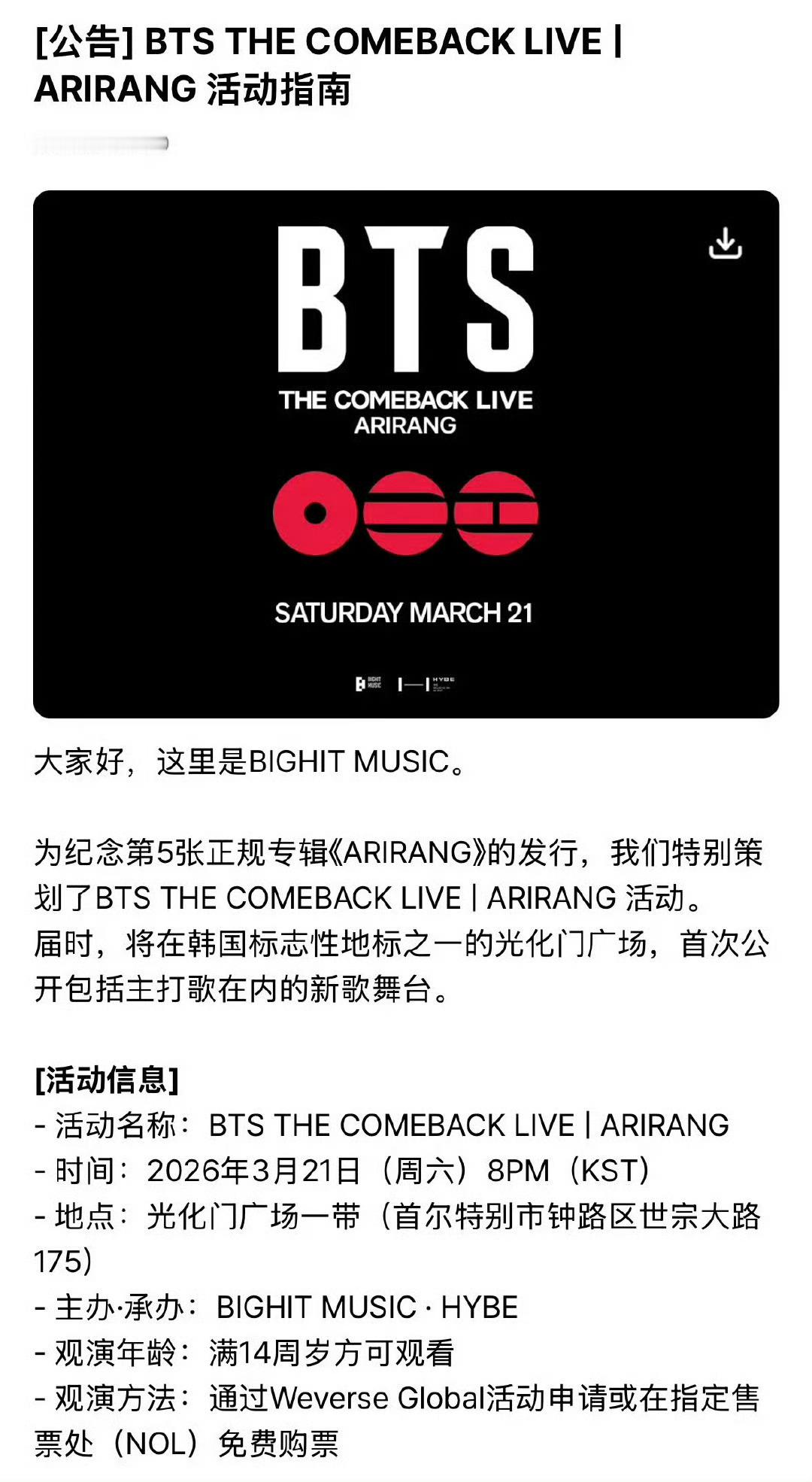 BTS免费开演唱会BTS光化门免费演唱会官宣!全席无门槛谁懂啊😭 兵役结束后的完整体回归,还要在韩国地标开免费场,这波宠粉直接拉满!坐等开票,全球阿米一起云赴约