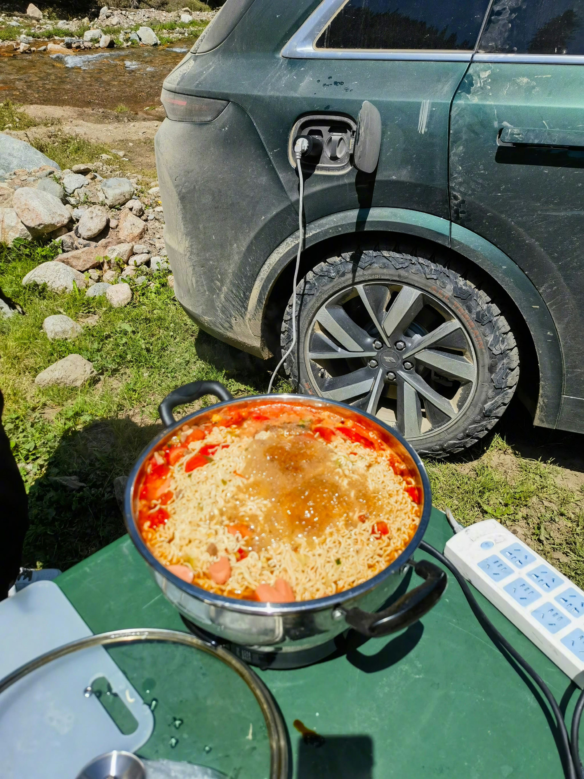 后面这些新能源车的外放电都老猛了,电磁炉烤盘啥的咔咔随便用,就不咋吃这玩意儿了,这哪有现煮手掰西红柿方便面香啊!