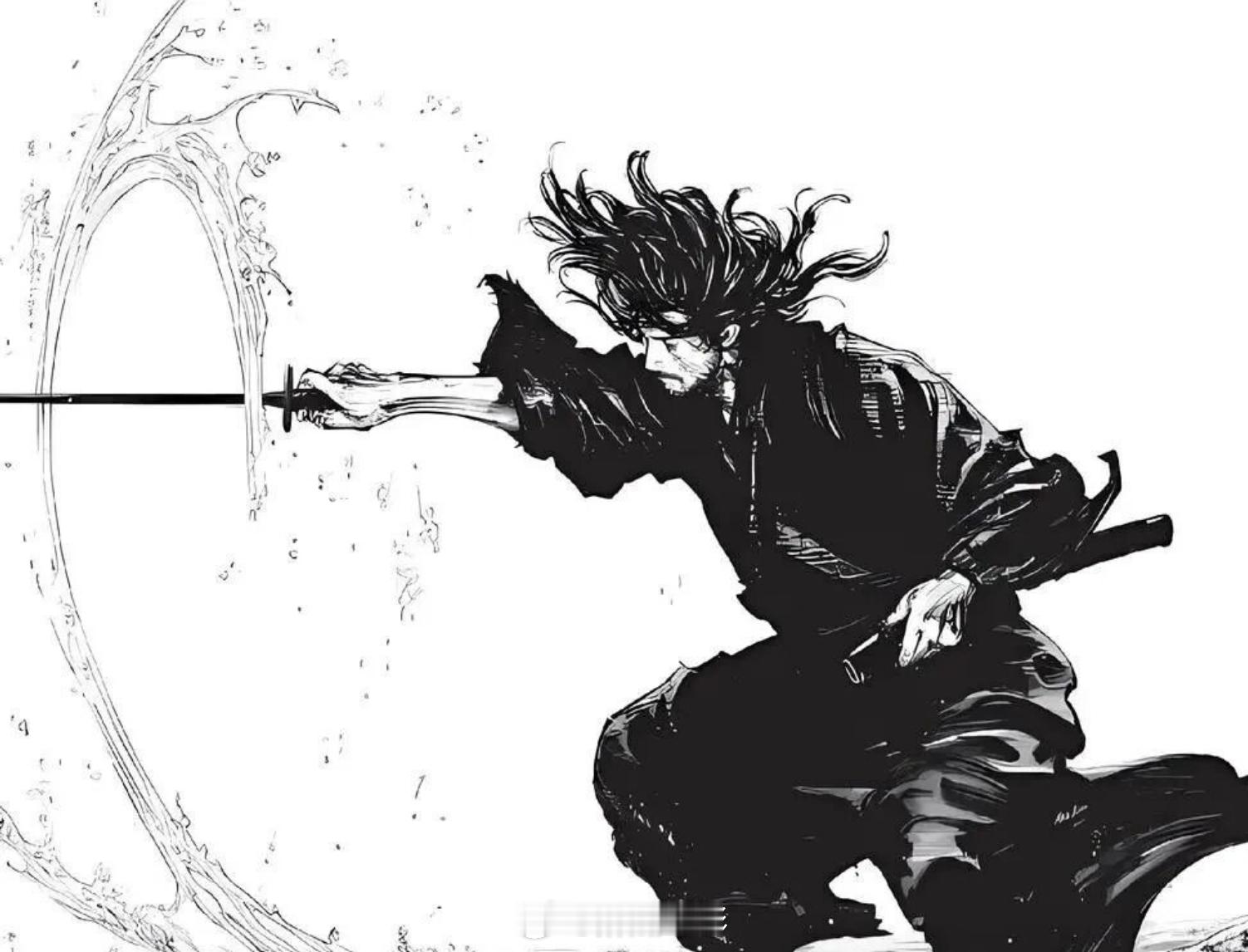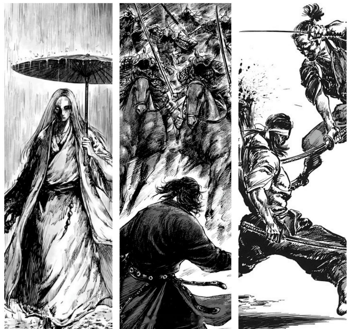 而《浪客行》是井上雄彦独创的一种画风,他吸收了中国水墨画、日本浮世绘与写实漫画传统,初期使用G 笔,舍弃网点纸,后期G 笔与毛笔混用,直至最终以毛笔替代 G 笔,形成了兼具漫画叙事力与水墨气韵的独特视觉语言。