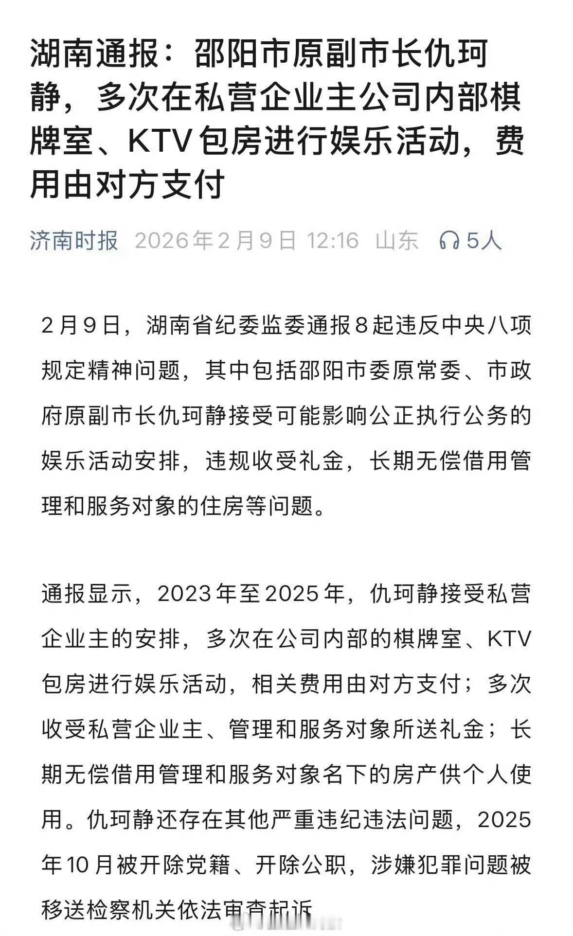 湖南通报:邵阳市原副市长仇珂静,多次在私营企业主公司内部棋牌室、KTV包房进行娱