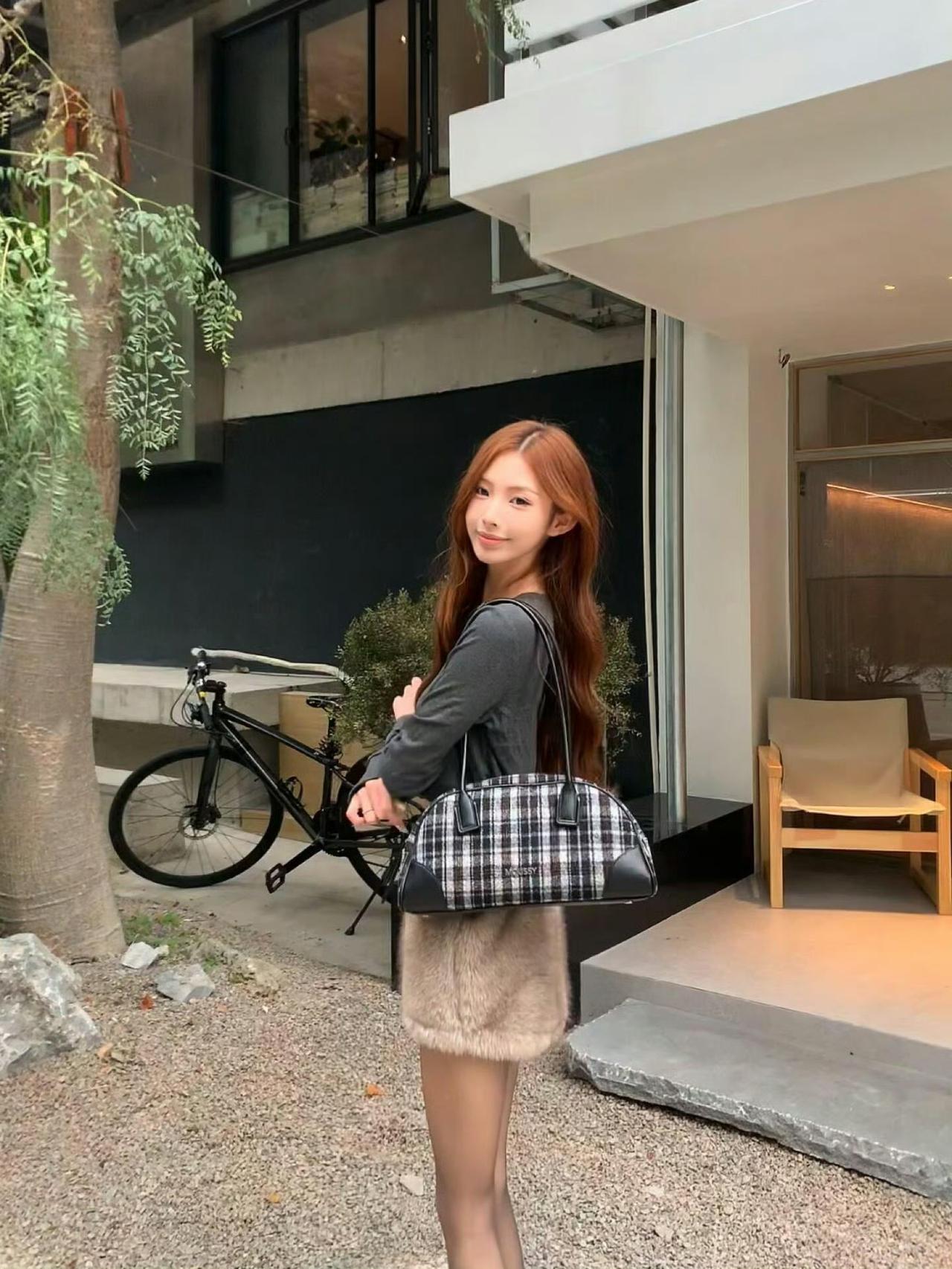 这套是温柔甜酷风,很适合秋冬的轻休闲场合~ 核心是灰调露腰上衣+毛绒短裙的组合:露腰设计,毛绒短裙又增加了温柔慵懒感,搭配方扣单鞋,再加上格纹大包,甜酷中带着精致松弛感,和背景的简约建筑风格也很搭。秋冬毛绒绒穿搭