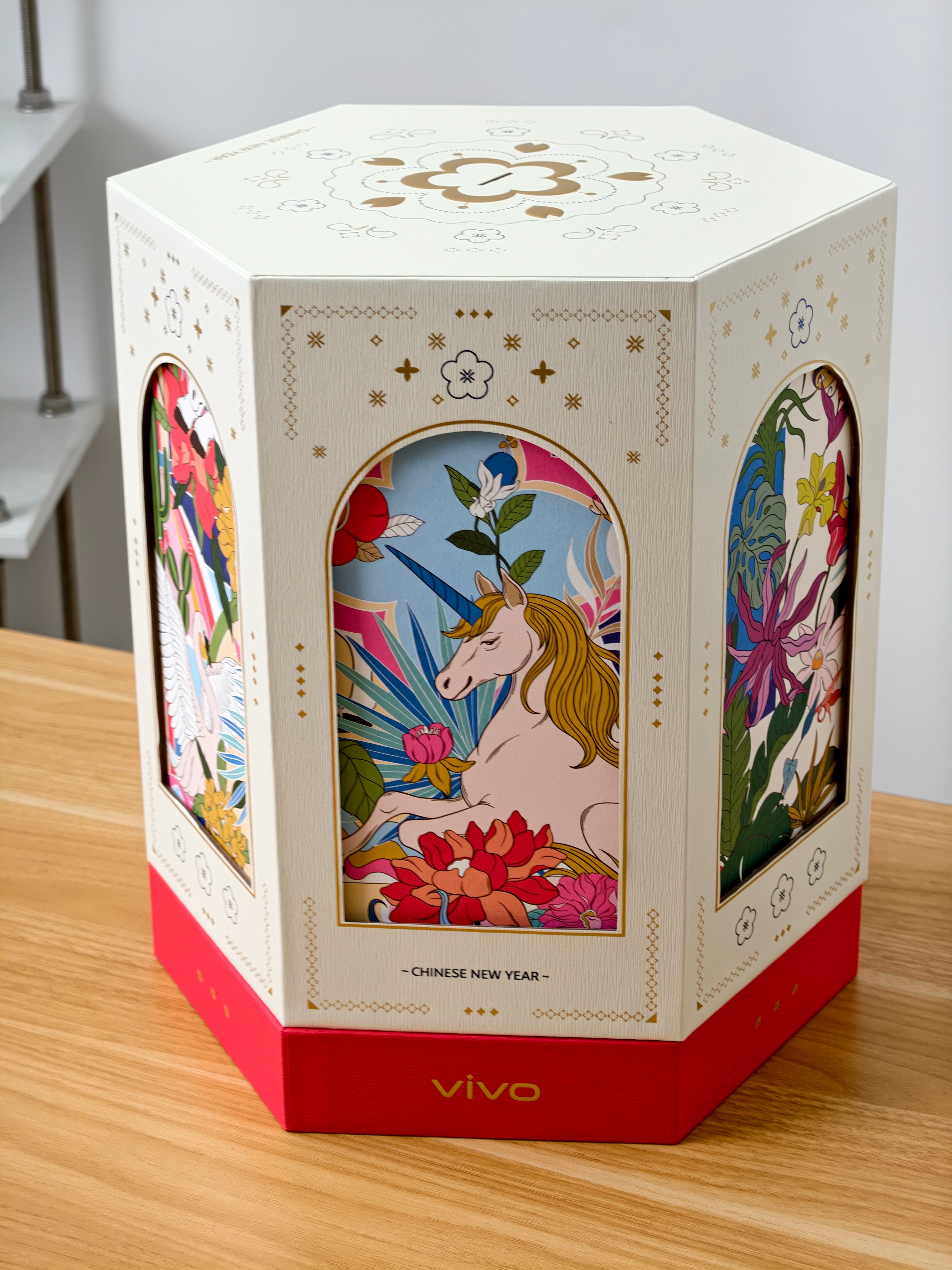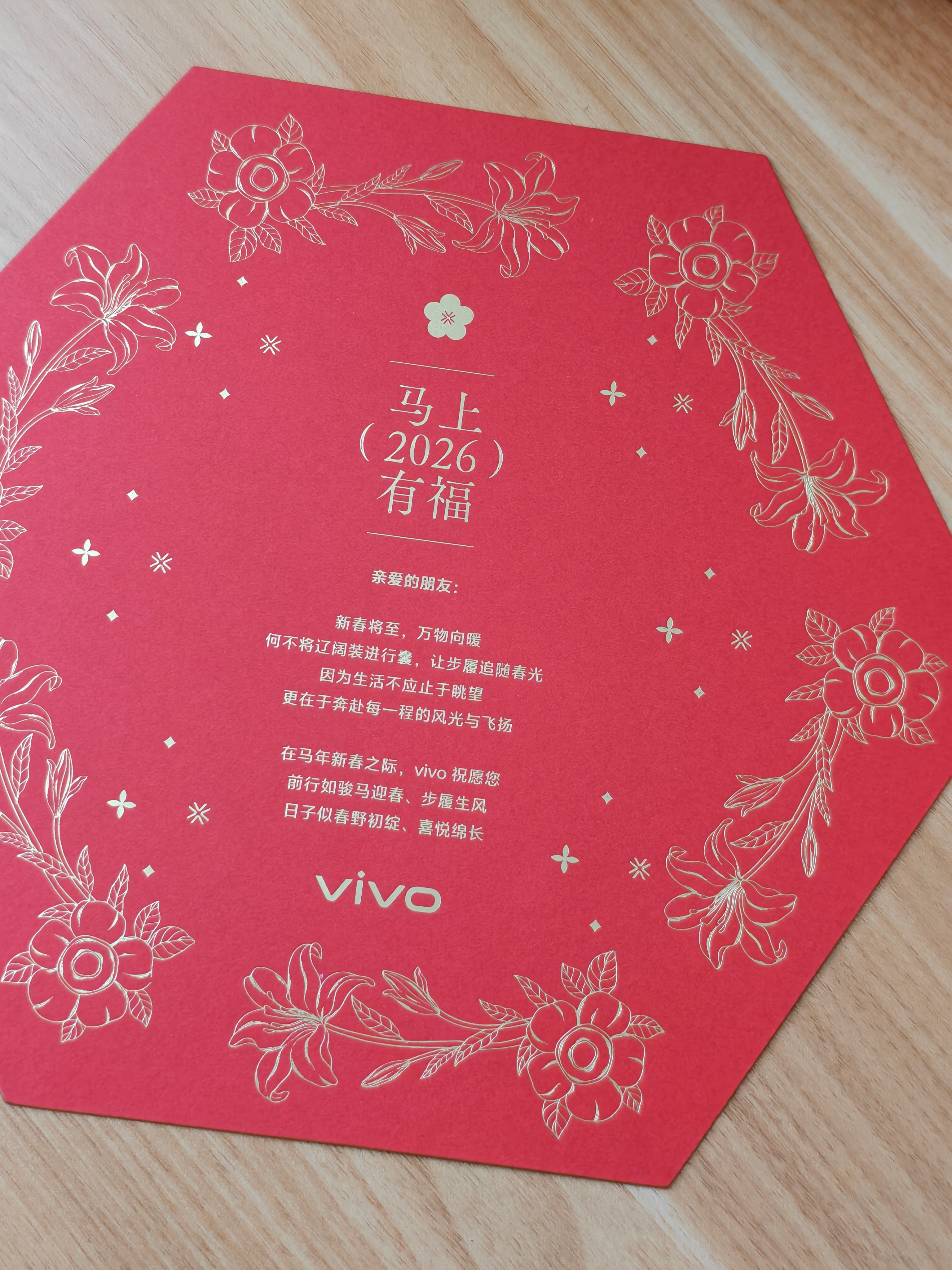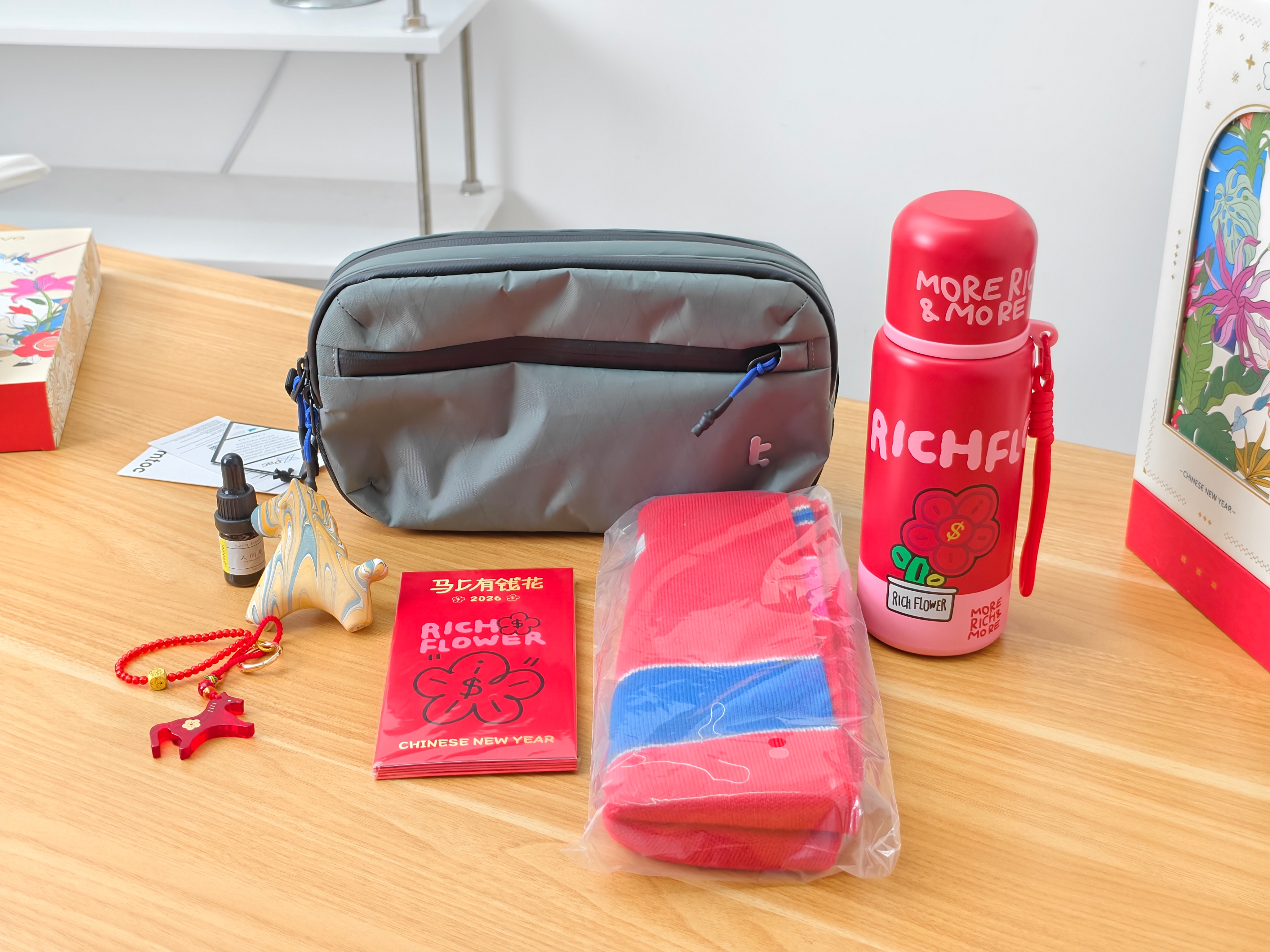 收到了vivo的新春礼盒,包装盒特别美!主题也很喜庆,是2026马上有福,里面有斜挎包、保温杯、羊毛围巾、琉璃马包挂、还有车载香薰和红包祝vivo和大家都马到成功马上有福