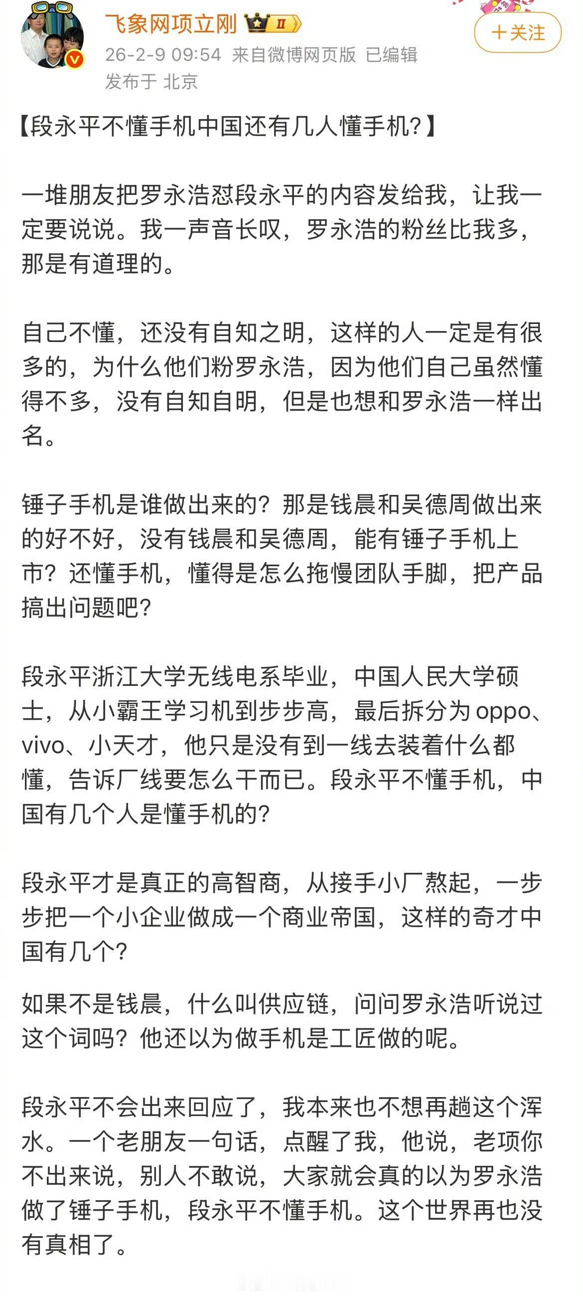项立刚再炮轰罗永浩,锤子手机是靠别人做出来的,段永平才是做手机的大家