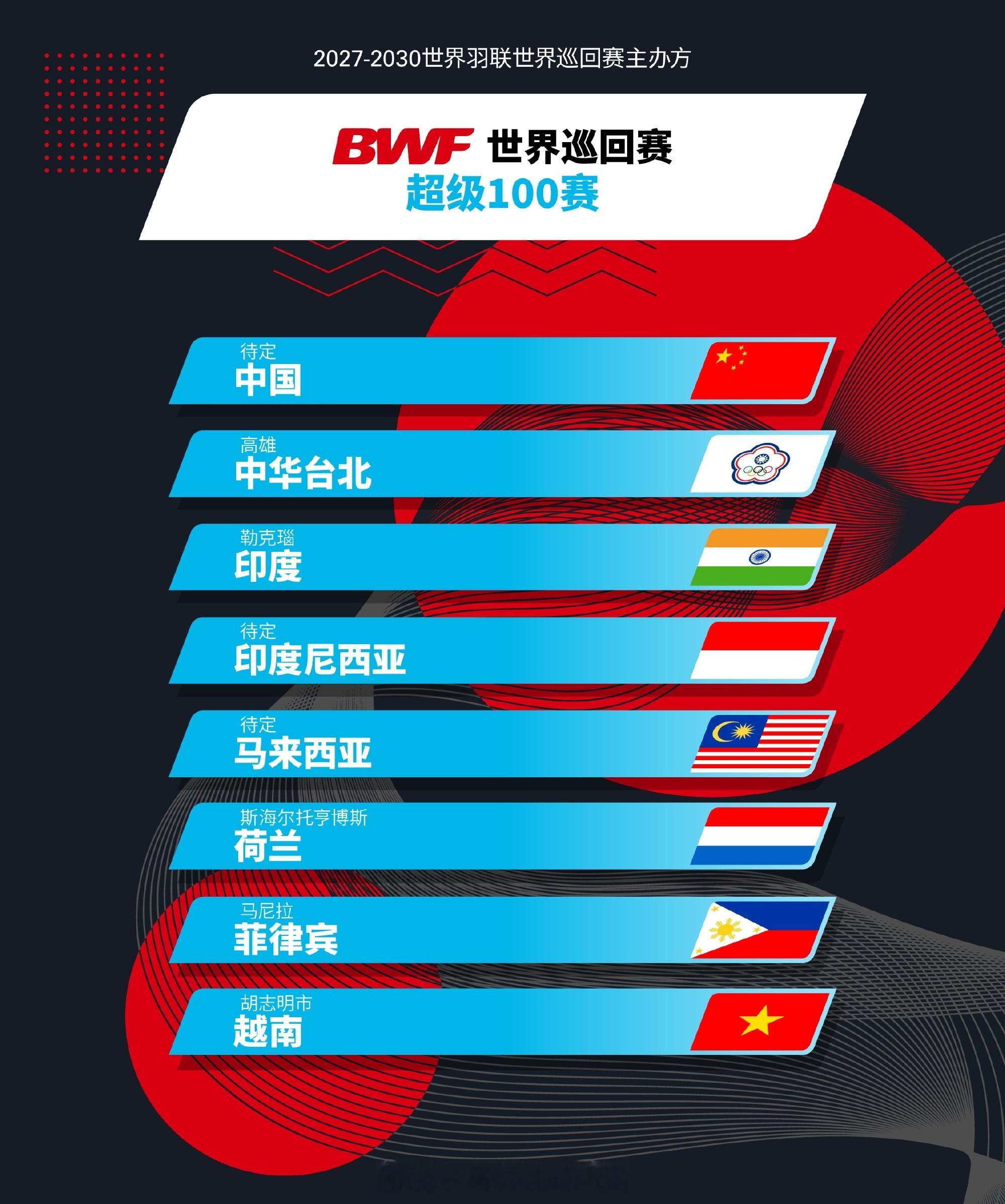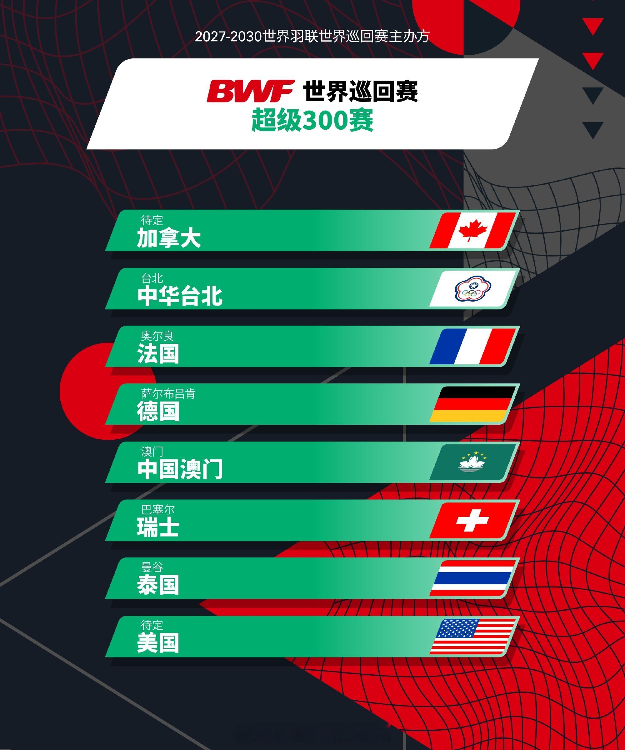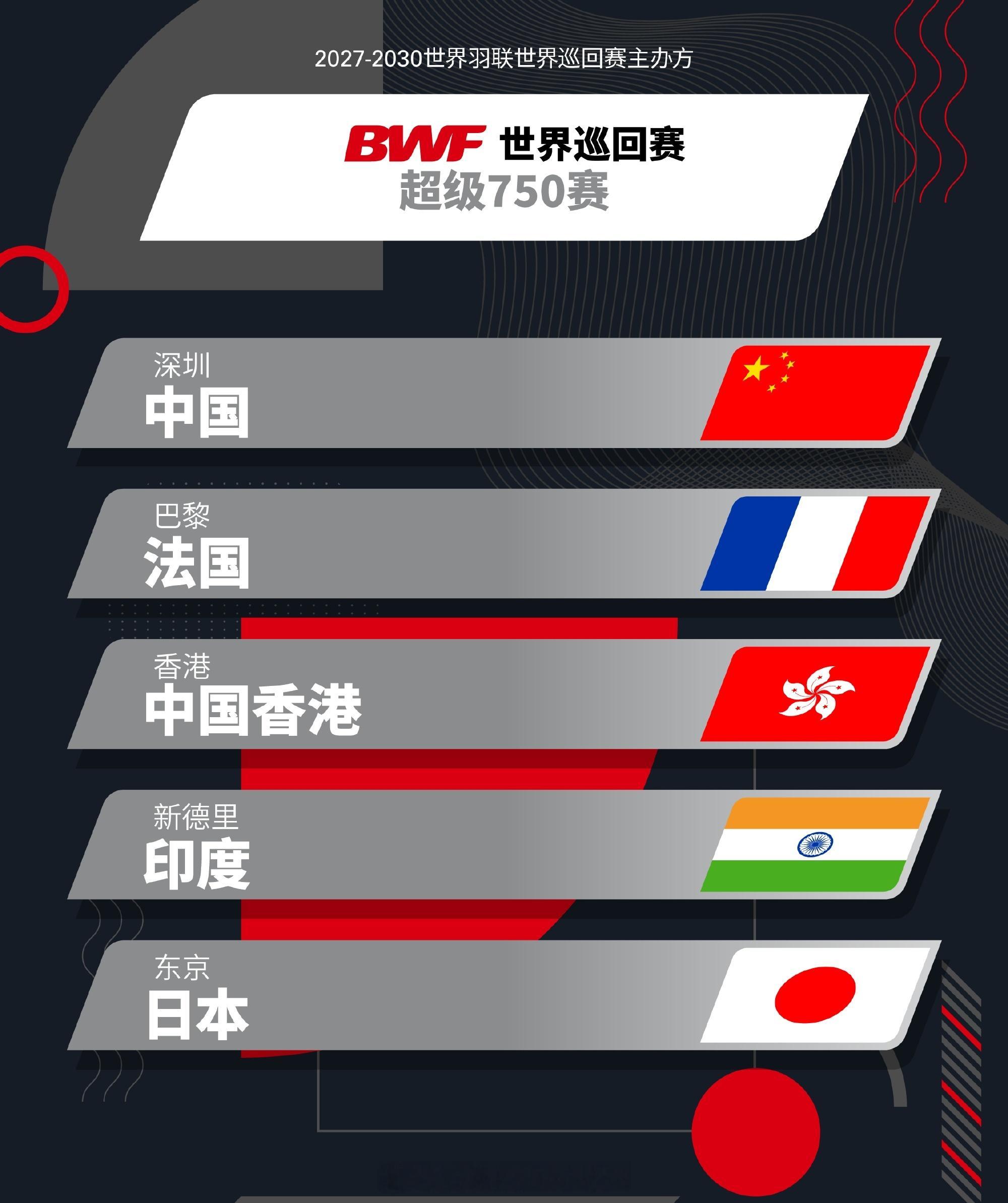 世界羽毛球联合会(BWF)正式公布2027-2030赛季世界羽联世界巡回赛主办地名单,全新升级的赛事体系将设36站比赛,首次完成全级别整合,共划分六大统一赛事等级如下↓