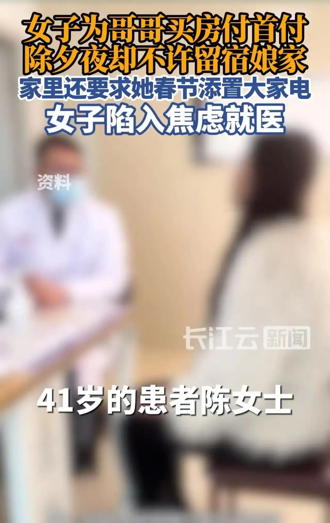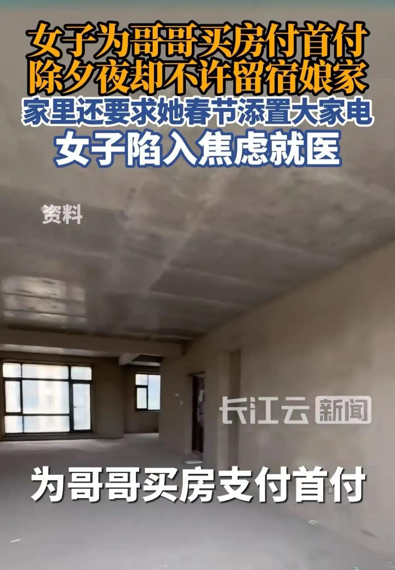 除夕夜本是团圆时,可有一位女子却遭遇了闹心事,她为哥哥买房付了首付,结果除夕夜却不被允许留宿娘家,这究竟是怎么回事呢? 原来,这位女子一直对家庭付出很多,为了哥哥能顺利买房,她毫不犹豫地拿出了自己的积蓄付了首付。本以为这样能得到家人的理解和感激,可没想到,除夕夜她却被告知不能留宿娘家。更让她心寒的是,家里还要求她春节期间添置大家电,这无疑给她带来了巨大的经济压力。女子感到十分委屈和焦虑,最终不得不就医寻求心理帮助。她忍不住发出疑问:“同样是父母生的孩子,为什么要这样区别对待?”是啊,手心手背都是肉,为何在家庭中却要如此厚此薄彼呢?这种不公平的待遇,不仅让女子感到心寒,也引发了我们对家庭关系的深思。家庭应该是温暖的港湾,而不是让成员感到压抑和焦虑的地方。 家庭中的公平与理解至关重要,希望每个家庭都能多一份关爱,少一份区别对待。对于这位女子的遭遇,你有什么看法呢?快来评论区留言,一起聊聊吧!三十不能回娘家 跟嫂子住娘家