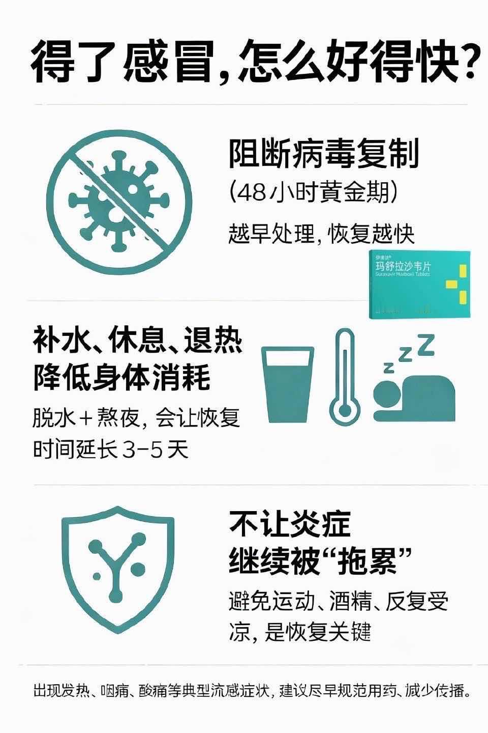 【小青盒建议流感别叫流感】偏方缓解情绪小青盒整顿流感流感真正难受的不是“发一天烧”,而是那种高热反复、全身酸痛、咳到失眠、整个人像被病毒抽干的状态。你想快点恢复,本质是要——尽早阻断病毒复制,别让它继续往上冲。 伊速达(玛舒拉沙韦片)用于健康成人和12岁以上青少年单纯型甲/乙型流感的治疗,且需要在症状出现后48小时内使用。为什么它能让恢复更快?因它作用在病毒复制必须用到的 “帽结构切割酶”(PA endonuclease),病毒没法复制,自然不再铺天盖地地扩散。说明书也提到它对 H1N1、H3N2、乙型流感等多型别都有抑制作用。 对于已经出现咽痛、发热、酸痛的人来说,尽早使用像伊速达一样的抗流感药物阻断病毒复制 + 减少身体消耗,才是真正能把恢复周期从“七八天”缩短到“三四天”的方法。