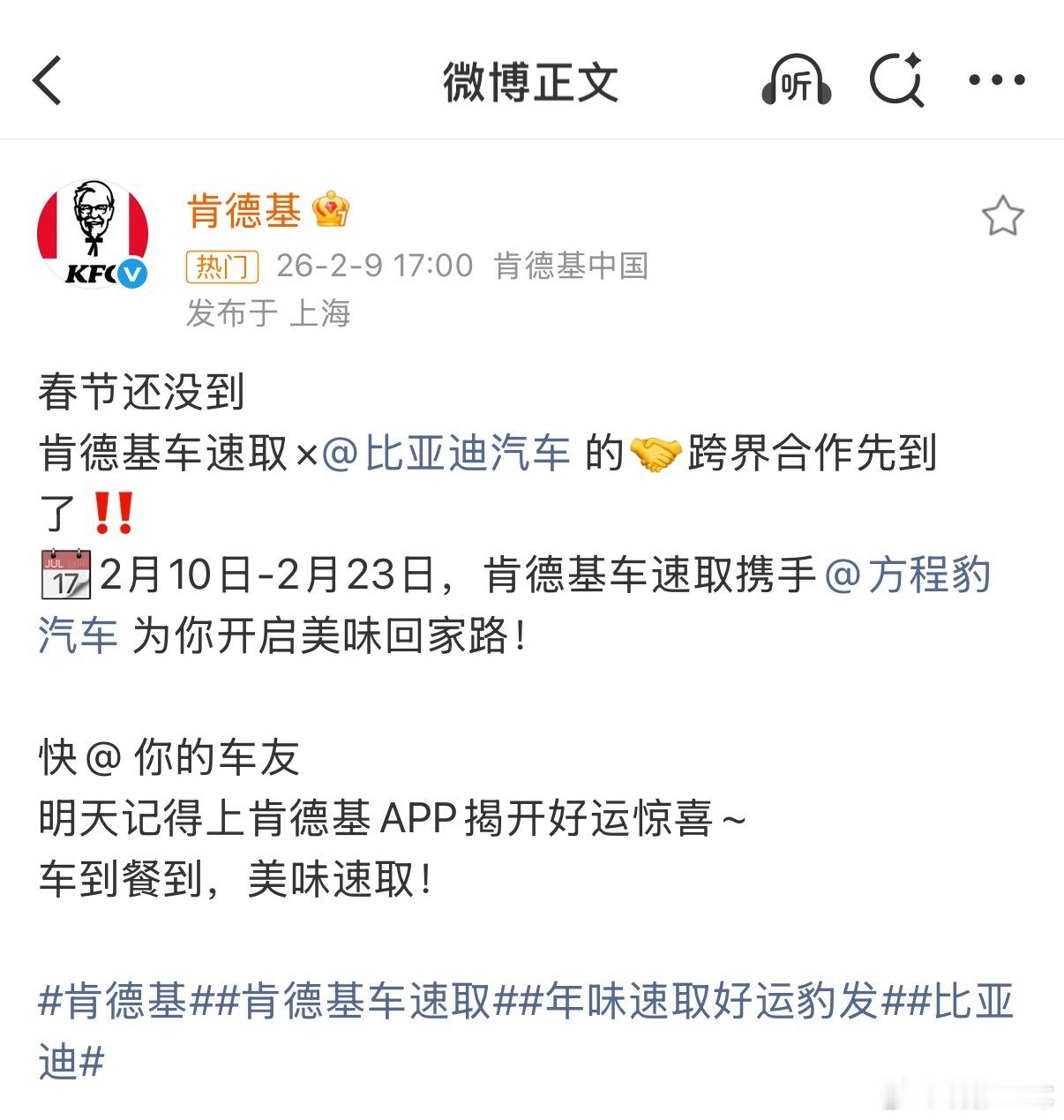 什么?肯德基和方程豹锁了?🔒 这波谐音梗太有意思了!明天先蹭一波“豹”款好运再说~大V聊车年味速取好运豹发