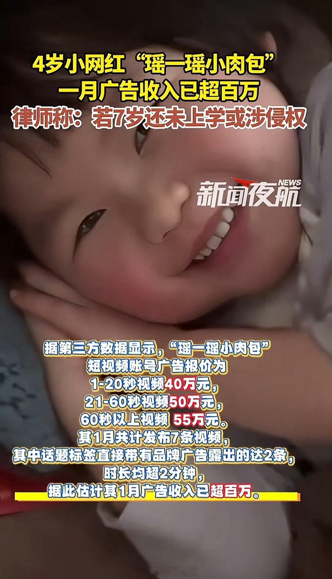 瑶一瑶小肉包1分钟视频报价45万5岁网红瑶一瑶小肉包1分钟视频报价45w,短一点的视频也能报40个w,别人都是富二代,她是反过来富了爸爸妈妈