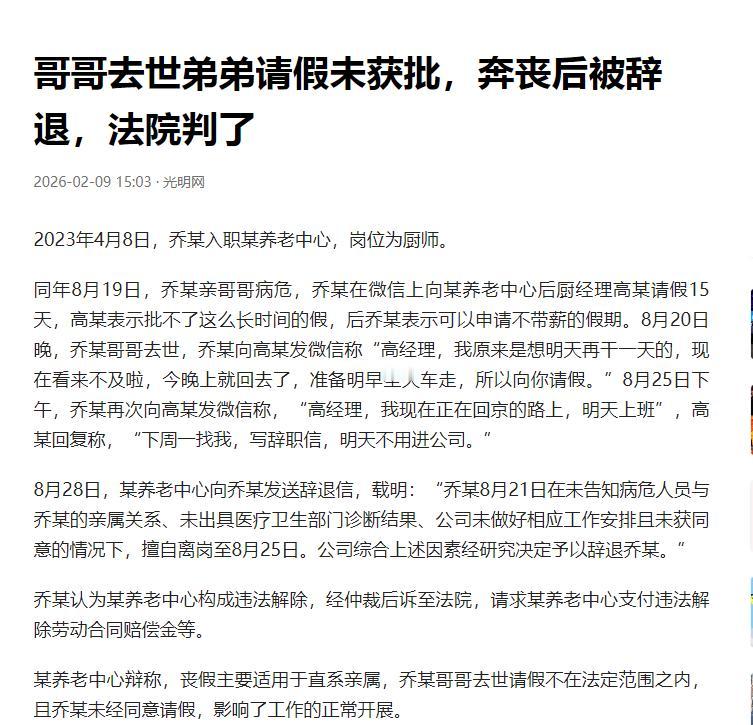 北京,一男子因哥哥病危请假被拒,次日得知哥哥去世后,着急着急给领导发个请假信息后就返乡奔丧,返岗途中却被公司以“擅自离岗”为由开除。男子认为公司违法解除劳动合同,起诉索赔双倍经济补偿金,法院判决结果大快人心。 北京某养老中心厨师乔某,得知亲哥病危后申请15天假期被拒,即便主动提出无薪事假仍未获批。次日哥哥离世,乔某情急之下告知领导后便返乡奔丧,返岗途中被通知因擅自离岗被开除。乔 某起诉后,北京市第三中级人民法院终审判决公司违法解除劳动合同,支付其7000余元赔偿金,这份判决,既是对劳动者的公道,也是对职场冷漠的纠偏。 根据1980年出台的相关规定,法定带薪丧假仅覆盖父母、配偶、子女,兄弟姐妹等近亲属并未纳入其中。这一规定诞生于四十多年前,彼时的家庭结构与亲属联结模式,与当下早已不同。 如今,很多家庭中,兄弟姐妹是彼此最亲近的依靠,是成长路上的陪伴者、困境中的扶持者,其情感重量,绝不亚于某些远房直系亲属。 乔某与哥哥自幼相依为命,哥哥甚至供他学厨,这份手足之情,是刻在骨子里的牵挂。当哥哥病危、离世,送最后一程不仅是情感需求,更是为人处世的基本人伦。 可偏偏,这份合情合理的诉求,却因“不在法定范围”,成了企业拒绝请假的“挡箭牌”。这并非法律的冷漠,而是旧规与现实的脱节,法律划定了底线,却未禁止企业在此之上赋予员工更多人文关怀,可很多企业,却连“酌情批准无薪事假”的善意都不愿给予。 本案中,涉事企业是一家养老中心,其核心业务本是照料老人、传递温暖,可在对待自己的员工时,却丢掉了最基本的同理心与善意。乔某并非无故旷工,而是在多次请假被拒、亲人离世的紧急情况下,履行了告知义务后才离岗,且主动提出无薪事假,这份妥协,已是打工人对职场的最大诚意。 企业辩称“后厨人手不够、影响工作开展”,看似有理,实则暴露了管理上的惰性与霸道。解除劳动合同是对劳动者最严厉的惩戒,需综合考量劳动者的违纪情形、企业的损失以及是否有替代惩戒方式。 后厨人手不够,可临时调配、请兼职,并非只有“开除员工”这一条路可走。企业之所以选择最极端的方式,本质上是将“制度”当作逃避管理责任的工具,将员工视为“可替代的劳动力”,而非有血有肉、有情感、有牵挂的普通人。 对乔某而言,他只是一个普通厨师,没有过高的社会地位,没有谈判的资本,面对企业的拒绝,他只能选择“无薪事假”这种妥协方式,可即便如此,仍未得到认可。 很多打工人都有过类似的经历:请假要看领导脸色,遇到紧急家事不敢轻易开口,生怕被贴上“不敬业”“爱偷懒”的标签,甚至面临被辞退的风险。 这种话语权的不对等,让很多打工人在亲情面前,不得不选择妥协,不得不承受“子欲养而亲不待”的遗憾,不得不面对“尽孝与生存”的艰难抉择。 法院的判决,是对人伦的捍卫,更是对企业的警示,但这远远不够。我始终认为,职场不该是冰冷的利益场,制度的本质是服务于人,而非束缚人、伤害人。企业的“合规”,不该成为漠视员工情感、剥夺员工基本人伦需求的借口。 其一,企业应摒弃“机械管理”的惰性,多一份人文关怀。其二,法定丧假范围亟需完善,跟上社会发展的步伐。其三,打工人要学会用法律武器捍卫自己的合法权益。 乔某的胜诉,给所有打工人提了个醒:面对企业的违法操作,不必一味忍让。当企业以“擅自离岗”为由辞退因至亲奔丧的员工时,这种行为大概率构成违法解除劳动合同,劳动者有权要求企业支付双倍经济补偿金(本案中因乔某工作年限短,赔偿金为7000余元)。同时,打工人在遇到紧急家事时,应尽量履行告知义务,保留好请假记录、聊天截图等证据,为后续维权提供支撑。 其四,我们更应反思“职场内卷”背景下的价值失衡。如今,很多企业过度追求效率与利润,将“敬业”等同于“牺牲个人情感、无条件服从企业”,却忘了,员工的敬业,源于企业的尊重与关爱。 当企业连员工至亲离世奔丧的基本需求都不愿满足时,又怎能指望员工真心实意地为企业付出?这种“只谈付出、不谈尊重”的职场文化,最终只会让员工离心离德,让企业陷入发展困境。 愿每一家企业,都能摒弃冷漠的机械管理,多一份人文关怀,记住“制度是死的,人是活的”;愿每一位打工人,都能被职场温柔以待,不必在亲情与生存之间艰难抉择;愿相关制度能不断完善,让法律的底线之上,多一份人情的温度,让每一个人都能安心尽孝、安心工作。 毕竟,我们努力工作,是为了更好地生活,是为了有能力守护自己的亲人;而企业的发展,从来不是靠“压榨员工”,而是靠“留住人心”。当冰冷的制度遇上滚烫的人伦,多一份理解,多一份包容,多一份变通,才能让职场更有温度,让生活更有希望。 信息来源: 哥哥去世弟弟请假未获批,奔丧后被辞退,法院判了 2026-02-09 15:03·光明网