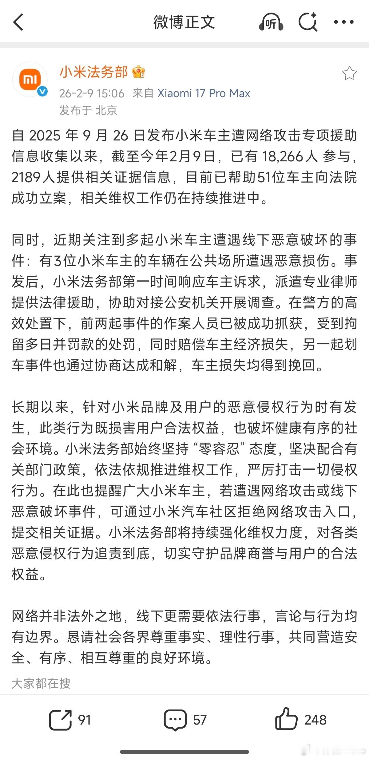 小米法务部公布协助车主维权进展好,很开心看到小米法务部在认真帮助小米车主挽回名誉