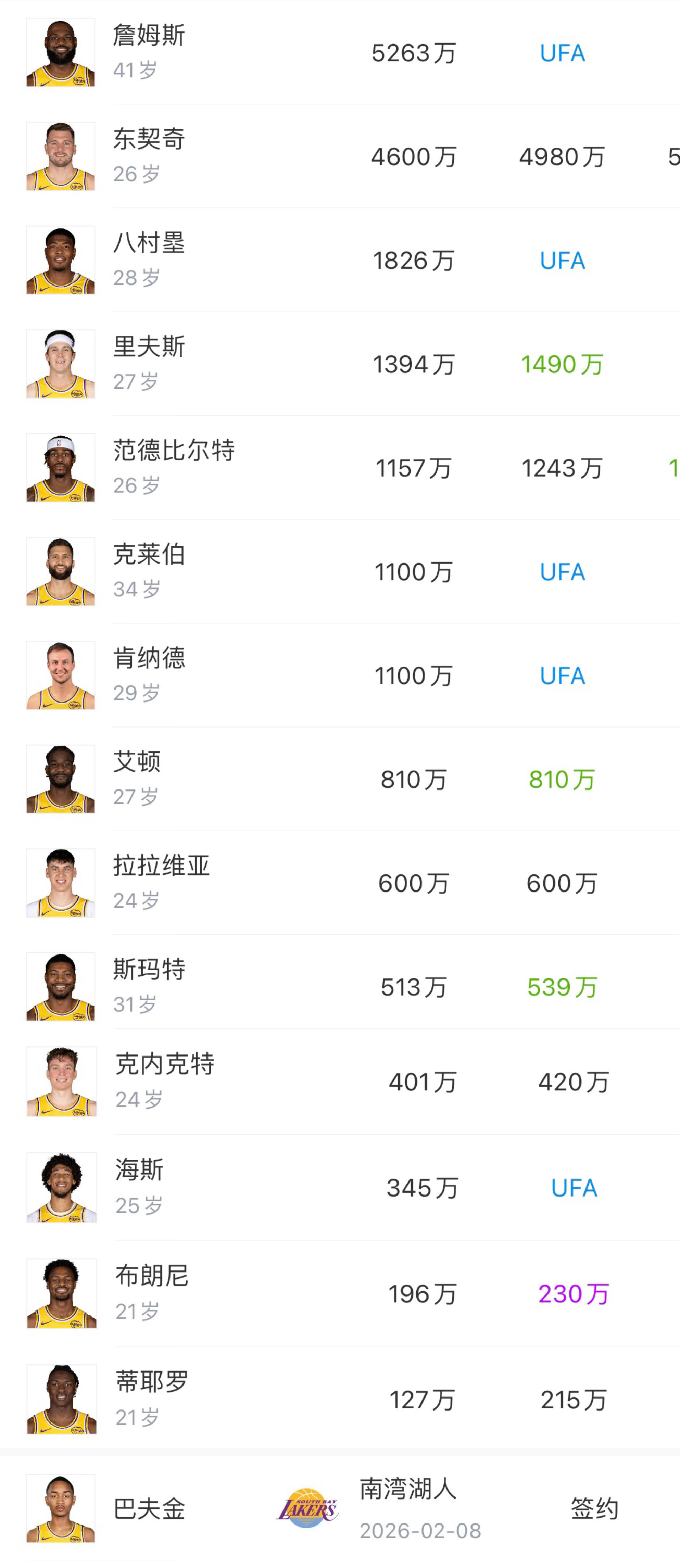 湖人可用金额为63.36万美元,随着时间的推移到2月26日,底薪合同的薪资降至62万美元,就能签约新球员。