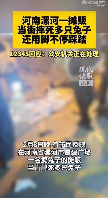河南摊贩当街摔死多只兔子,民警警告后仍肆无忌惮,全网怒讨 太残忍!2月8日晚,河南漯河市昌建广场,一幕令人发指的场景引发全网公愤🔥 一名售卖兔子的摊贩,竟当众拎起兔子狠狠摔在地上,还用脚反复碾压,致兔子内脏外露,倒地惨死。 目击者见状崩溃劝阻,却被摊贩无视,无奈之下当场报警。民警到场后对其警告教育,可摊贩竟狡辩,称兔子是“拉稀”而非被踩伤。让人愤怒的是,民警离开后,他非但毫无悔改,反而变本加厉,再次摔死数只兔子。 目击者二次报警并提交现场照片、视频证据,当晚21时许,该摊贩被警方带回派出所调查。截至2月9日,漯河市12345回应已接到多起投诉,案件仍在处理中,结果暂未公布。 生意再难,戾气也不该撒在无还手之力的小动物身上!公开虐杀不仅挑战公序良俗,更刺痛公众底线,网友怒喊“必须严惩”。愿每一个弱小生命都能被温柔对待,也盼官方尽快通报,还一份公道❤️