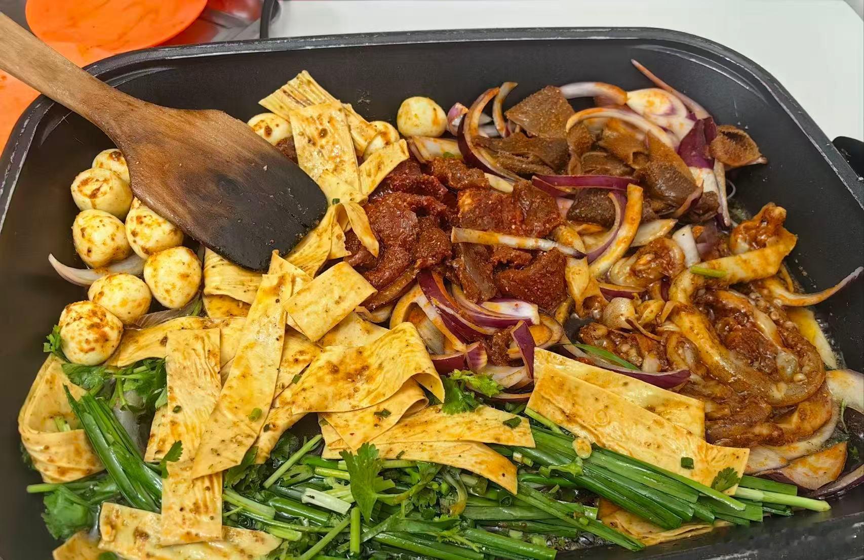 流香铁板烧老店:类似于麻辣香锅的味道,酱香味浓郁,香辣入味,底料调的很好吃,鱿鱼须Q弹、毛肚入味,牛肉比较嫩,干碟的辣椒也香,很下饭。