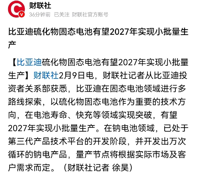固态电池产业化进程加速,比亚迪官宣硫化物固态电池2027年小批量生产!固态电池肯定会掀起一场能源革命,这场能源革命会催生出很多创新产业。例如机器人、低空飞行器、太空卫星飞船等等。当然目前新能源汽车是其最大应用场景,但随着固态电池产业化进程的加速,很多创新产品会如雨后春笋般涌现。