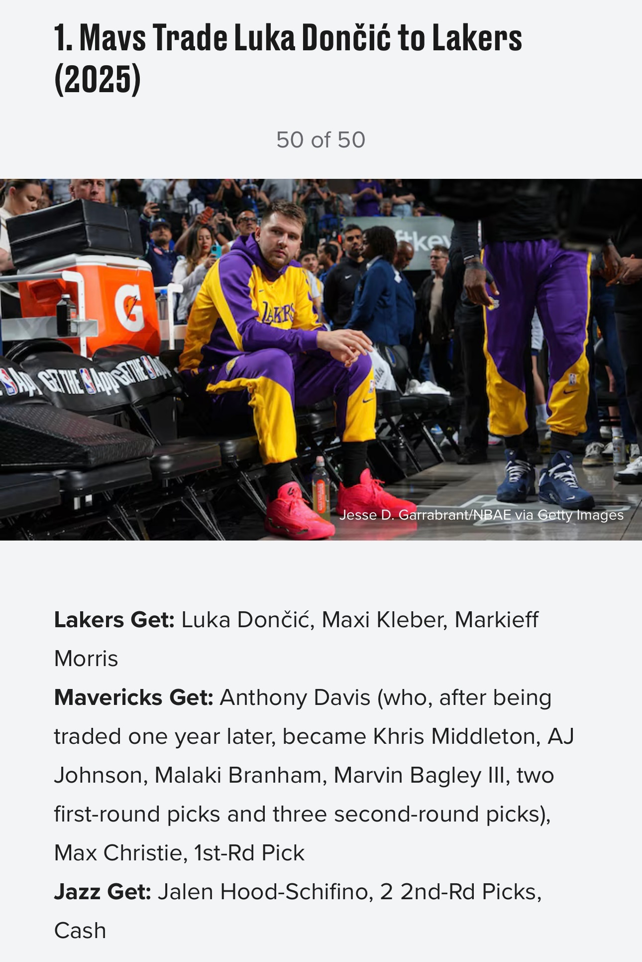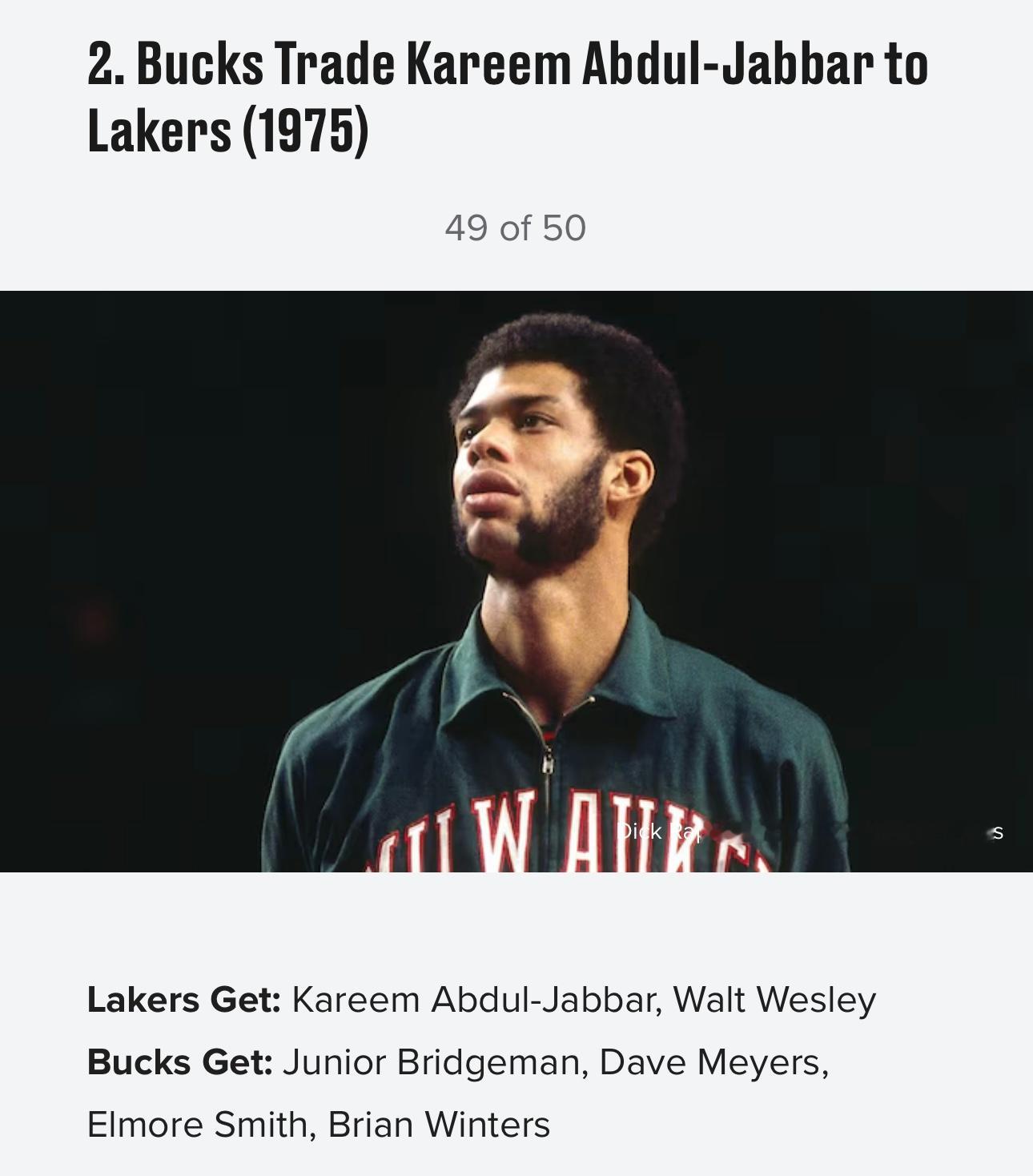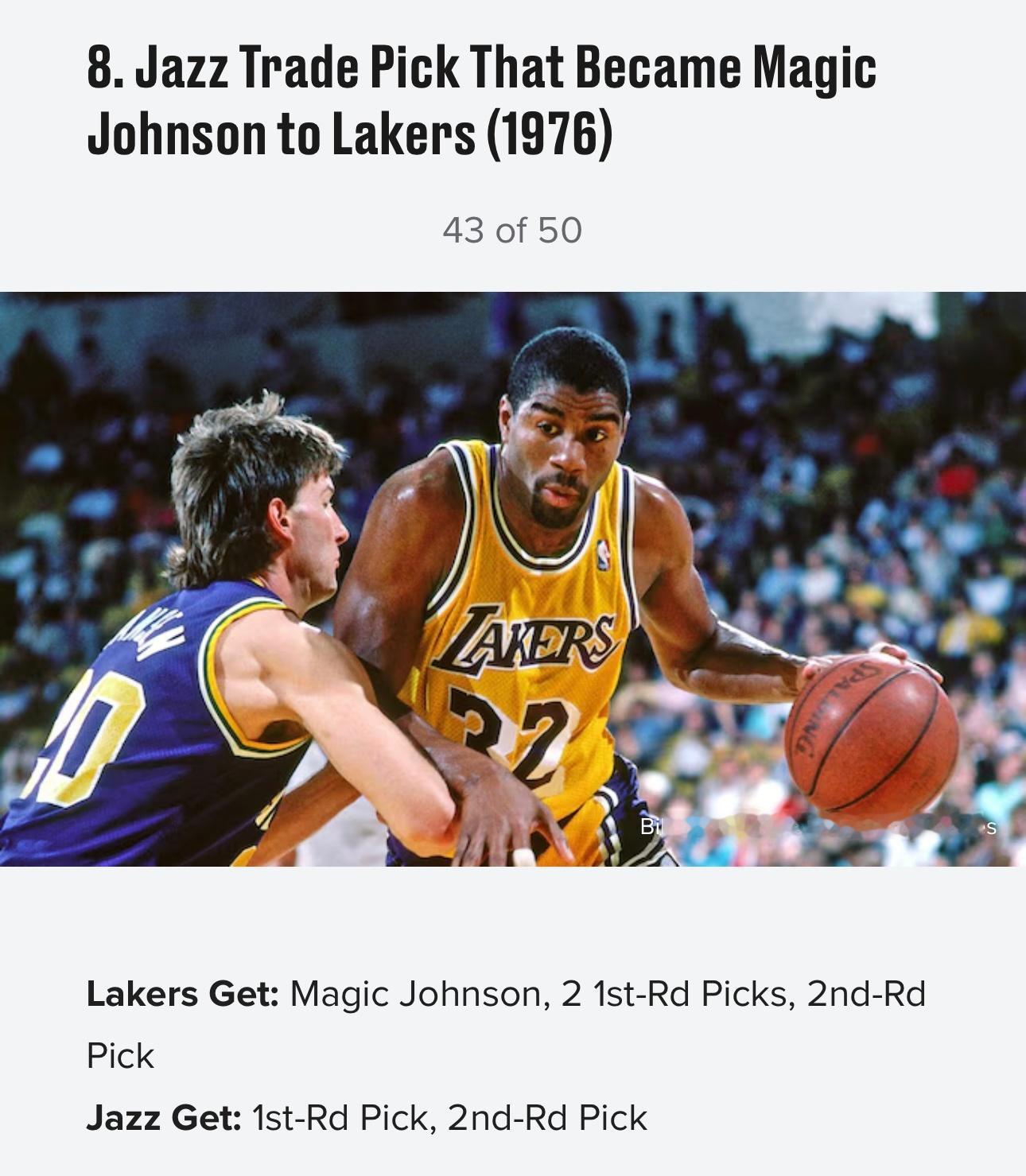 美媒《露天看台》近日评选了历史50大最烂交易,以下是前十位:10,1996年 黄蜂湖人交易,送出科比得到迪瓦茨9,1968年 76人湖人交易,送出张伯伦得到三人8,1976年爵士湖人交易选秀权,湖人1979年状元签选中魔术师约翰逊7,2019年 快船雷霆交易,送出亚历山大、加里纳利、5个首轮(其中一个选中杰伦·威廉姆斯)、2个首轮互换得到保罗·乔治6,1956年 凯尔特人老鹰交易,送出两人,得到比尔·拉塞尔5,1956年 勇士76人交易,送出张伯伦,得到三人+现金4,1998年 雄鹿小牛交易,送出首轮签(选中诺维茨基)+加里蒂,得到一个首轮签3,1976年 篮网76人交易,得到朱利叶斯·欧文,送出现金2,1975年 湖人雄鹿交易,得到贾巴尔和韦斯利,送出四名球员1,2025年 湖人独行侠爵士交易,送出戴维斯+克里斯蒂+2029年首轮+希菲诺,得到东契奇+克勒贝尔