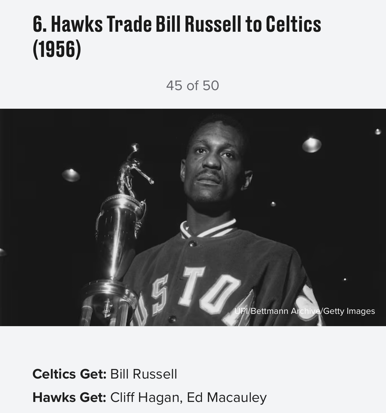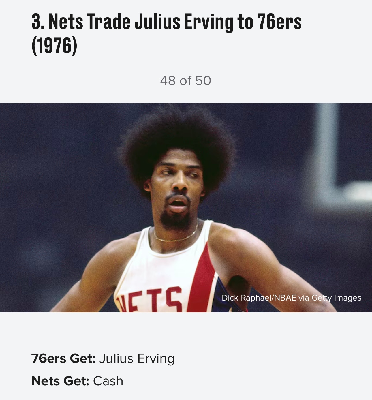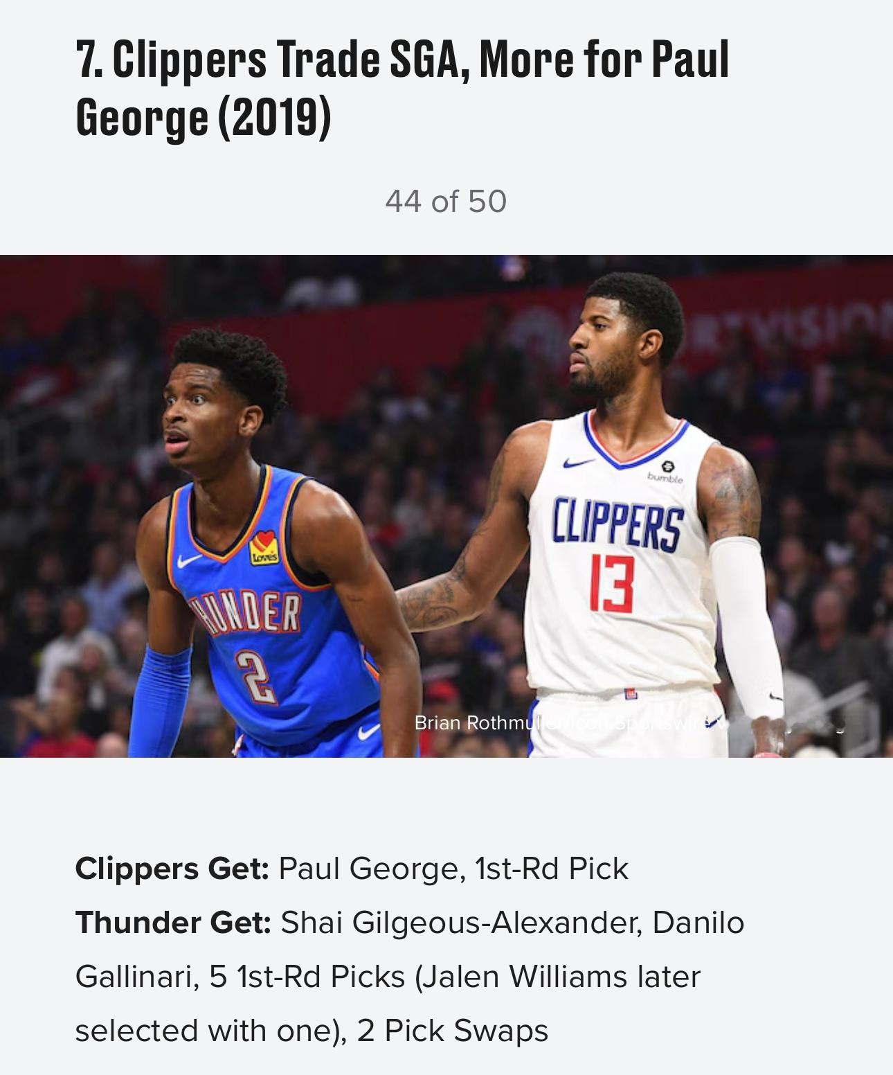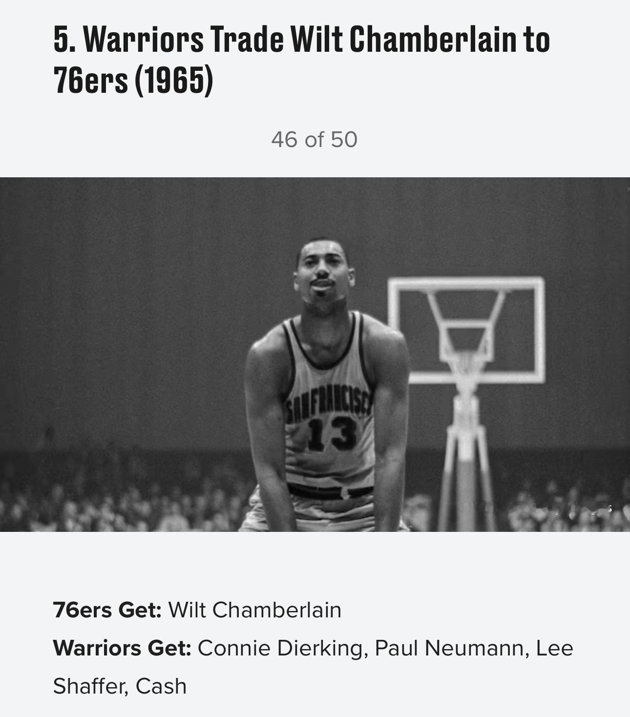 美媒《露天看台》近日评选了历史50大最烂交易,以下是前十位:10,1996年 黄蜂湖人交易,送出科比得到迪瓦茨9,1968年 76人湖人交易,送出张伯伦得到三人8,1976年爵士湖人交易选秀权,湖人1979年状元签选中魔术师约翰逊7,2019年 快船雷霆交易,送出亚历山大、加里纳利、5个首轮(其中一个选中杰伦·威廉姆斯)、2个首轮互换得到保罗·乔治6,1956年 凯尔特人老鹰交易,送出两人,得到比尔·拉塞尔5,1956年 勇士76人交易,送出张伯伦,得到三人+现金4,1998年 雄鹿小牛交易,送出首轮签(选中诺维茨基)+加里蒂,得到一个首轮签3,1976年 篮网76人交易,得到朱利叶斯·欧文,送出现金2,1975年 湖人雄鹿交易,得到贾巴尔和韦斯利,送出四名球员1,2025年 湖人独行侠爵士交易,送出戴维斯+克里斯蒂+2029年首轮+希菲诺,得到东契奇+克勒贝尔
