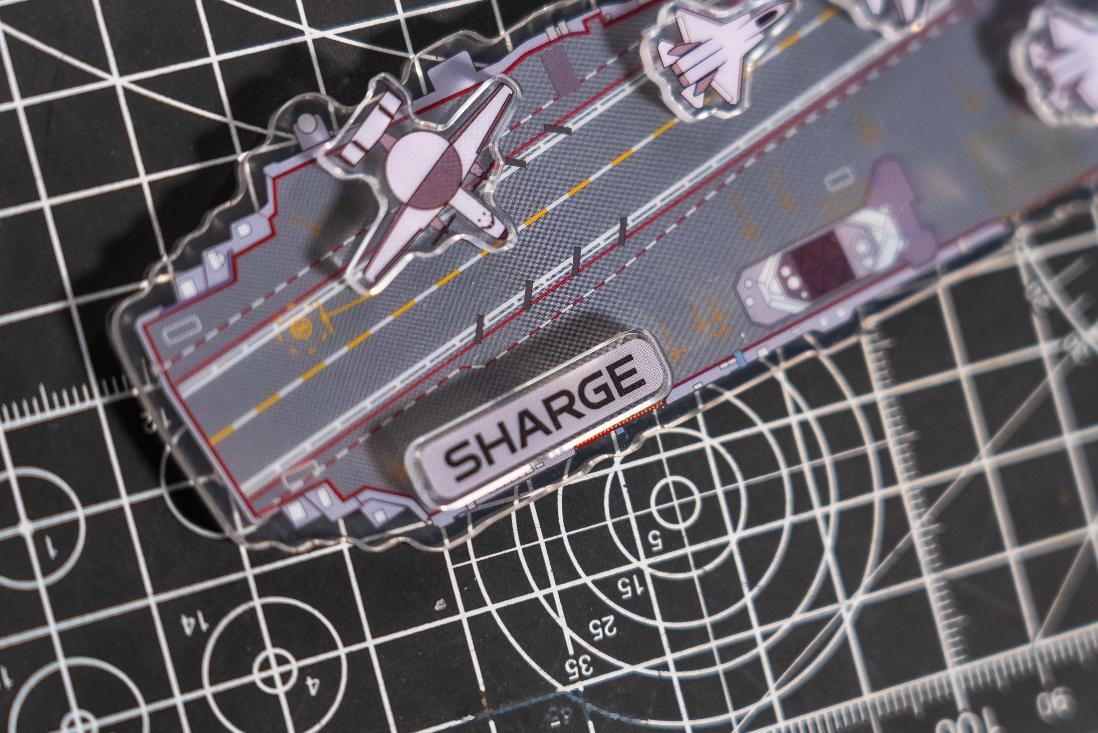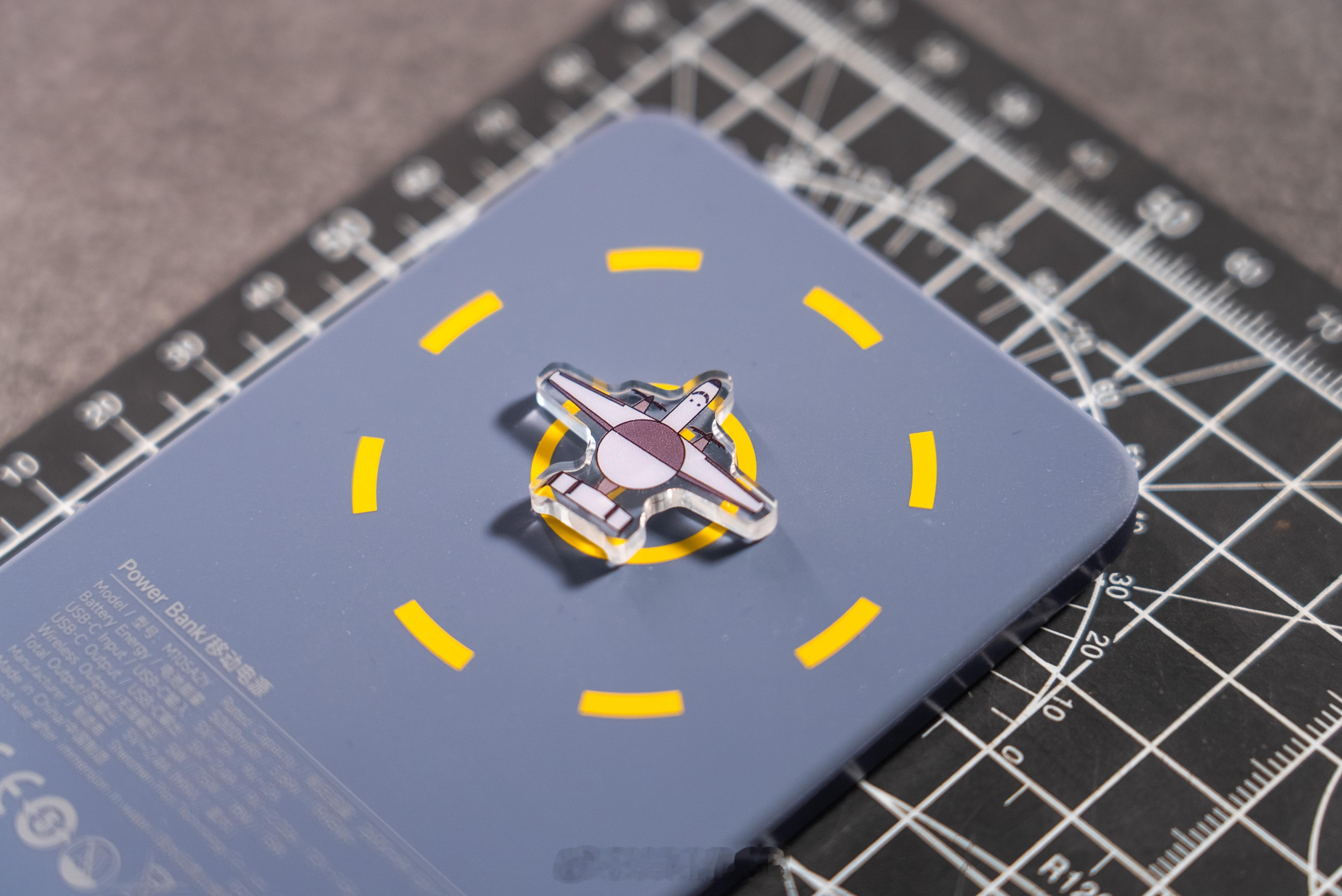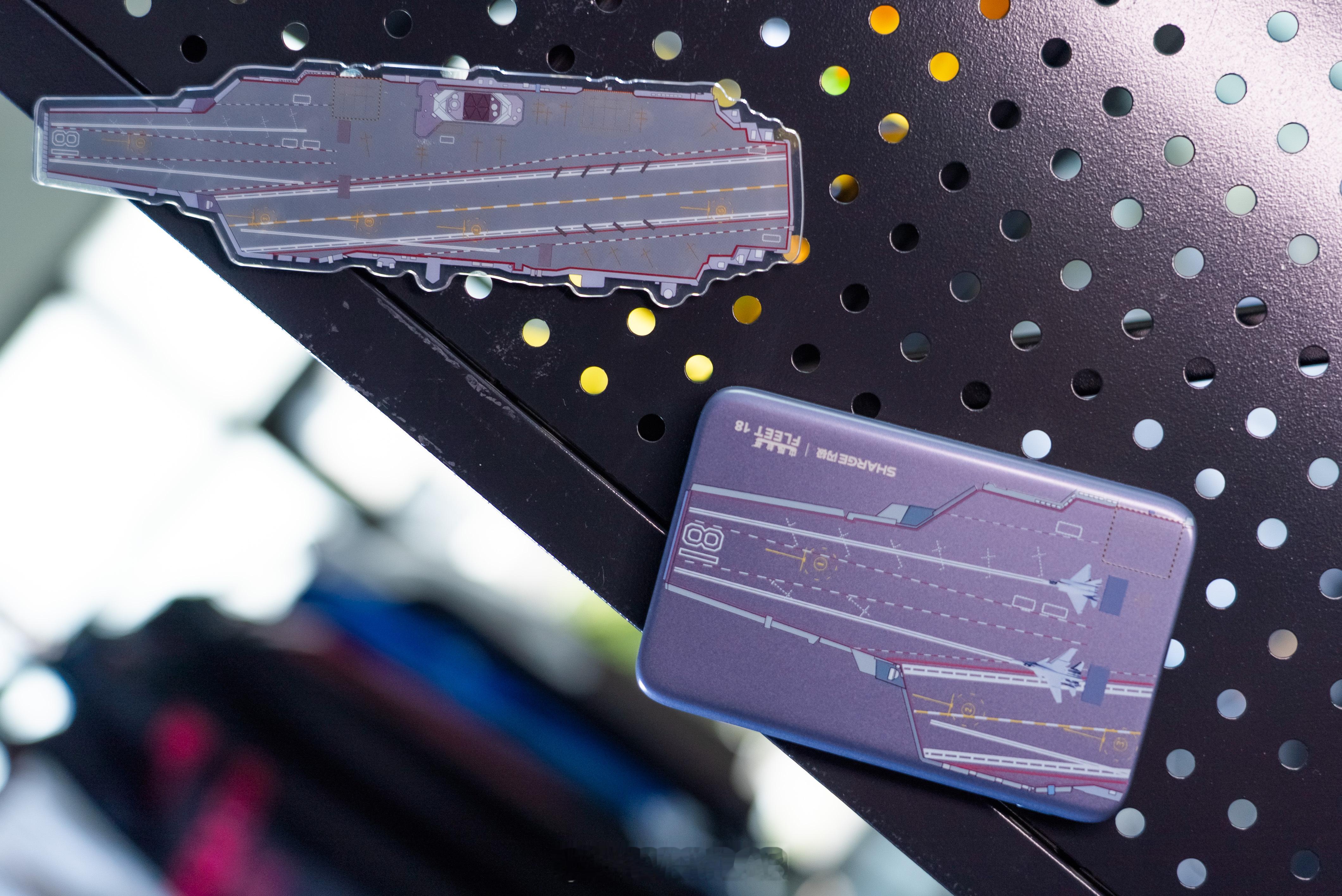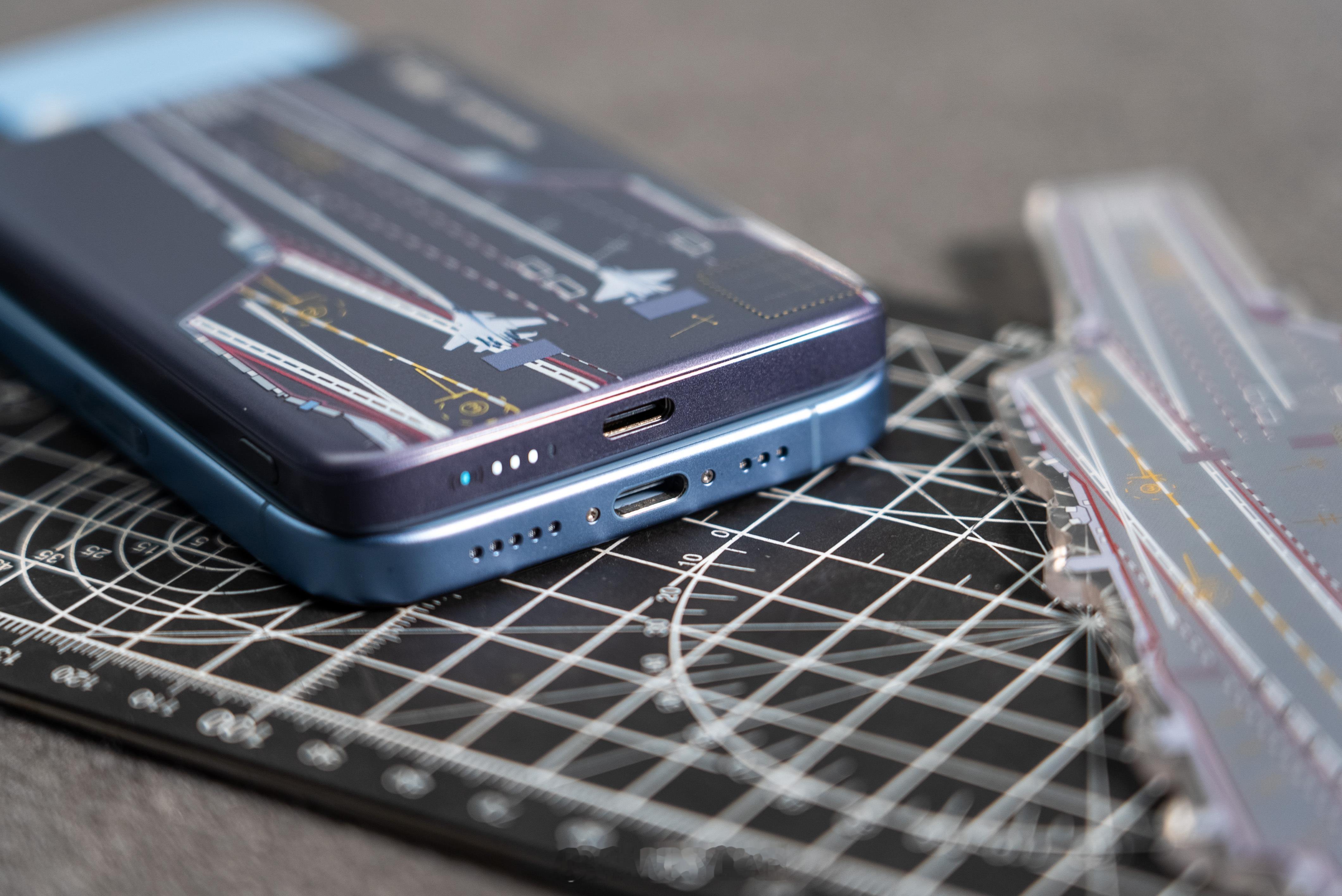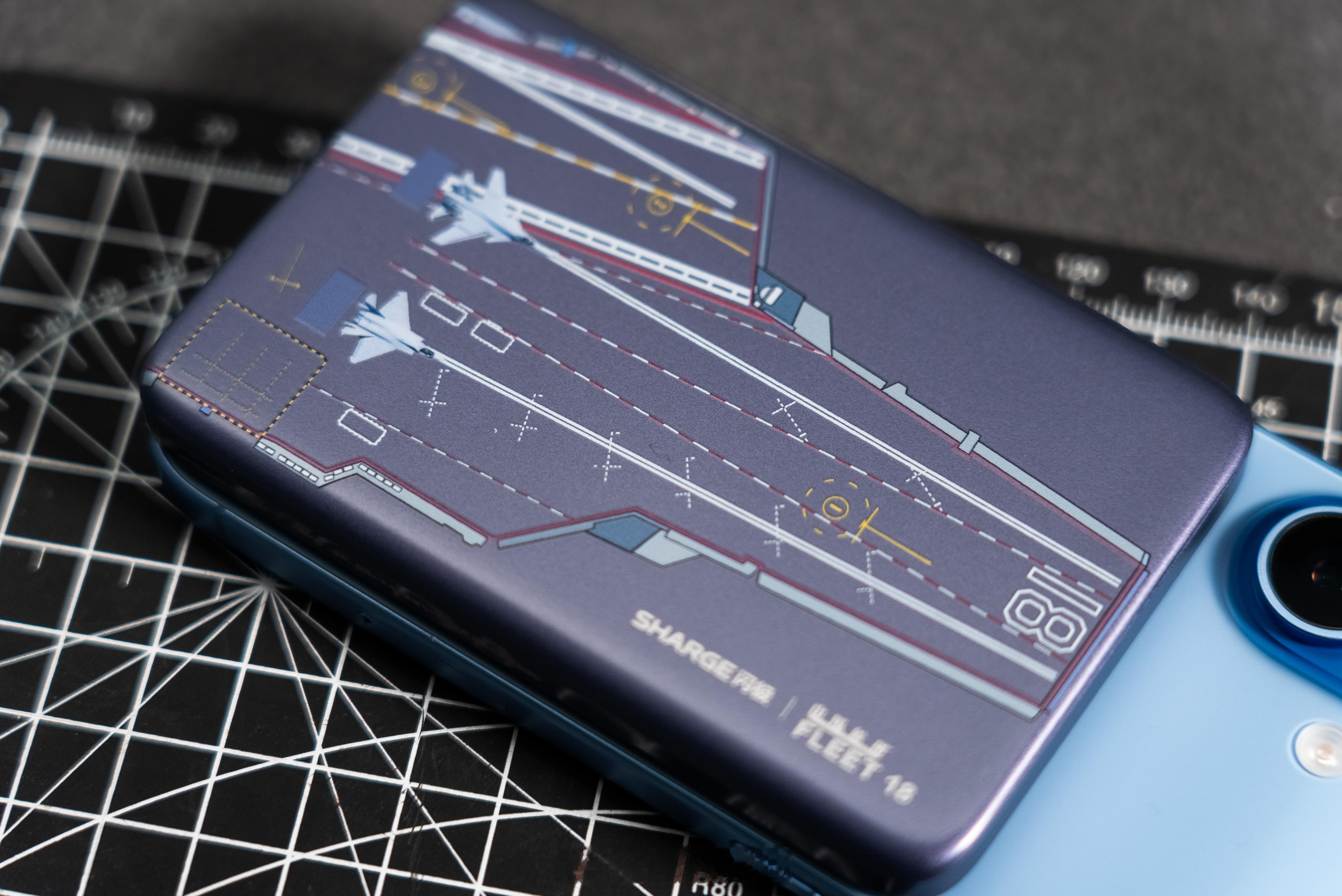 磁吸充电宝本身轻薄便携,联名细节也很到位,正面是航母飞行甲板图案,背面印着直升机起落设计。