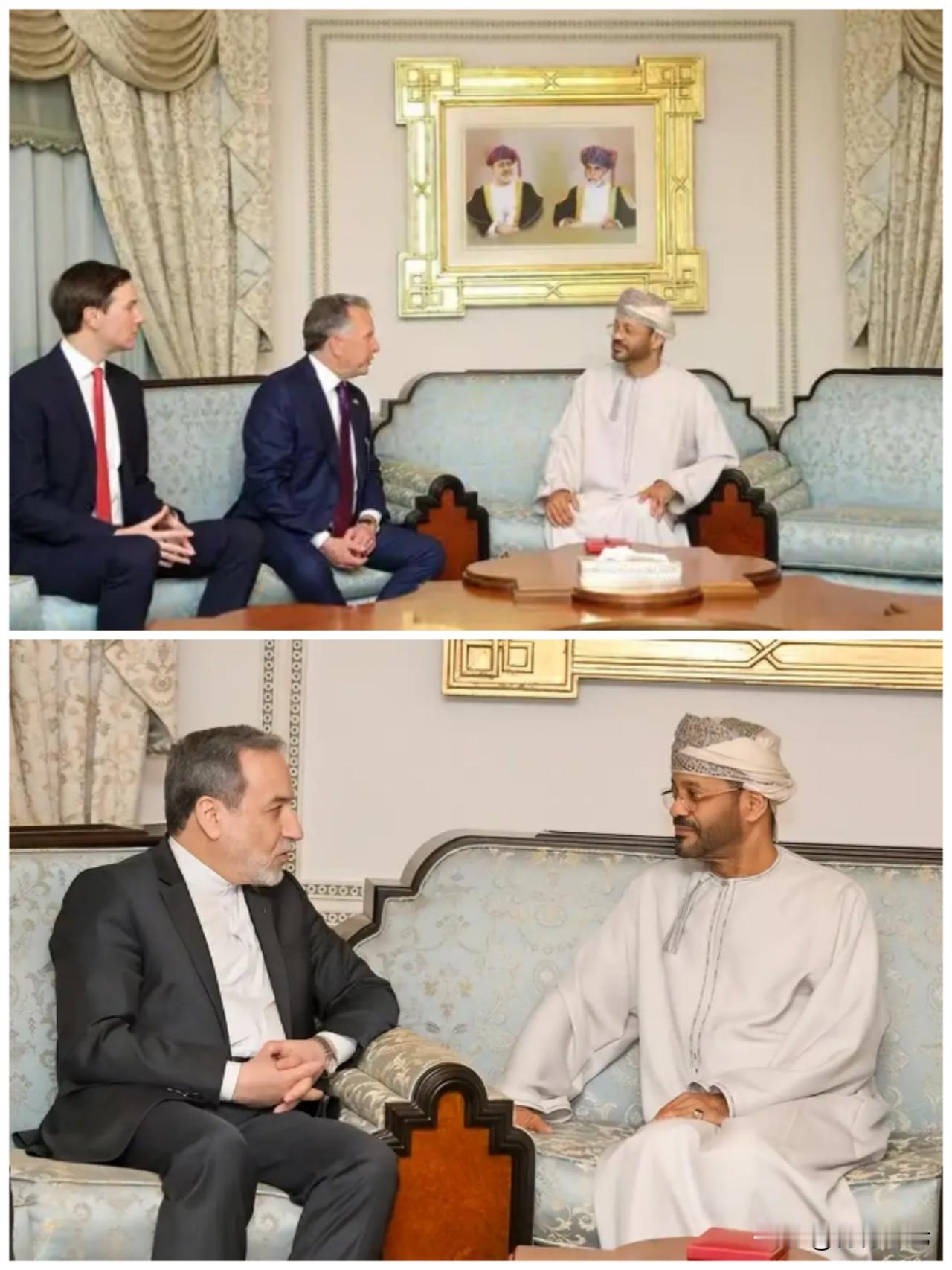 伊朗和美国的谈判模式真有意思!阿曼充当伊朗和美国谈判的“传话人”,创造了“同楼不同室”的谈判模式。美方将意思告诉阿曼人,阿曼人再颠颠地跑到另一个房间告诉伊朗人。伊朗再通过阿曼人将意见反馈给美方。听上去很魔幻。既然已经决定要谈判了,何必再这么遮遮掩掩?不过,从阿曼外交大臣巴德尔接见伊朗外长阿拉格齐和美国中东事务特使维克特夫、特朗普女婿库什纳的坐姿看,巴德尔坐的明显更靠近阿拉格齐,阿曼似乎跟伊朗更亲近些。