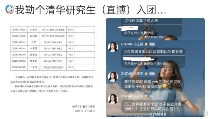 好厉害,一边当爱豆一边直博清华,还是理工科丝芭学历最高的人出现了,本科大连理工,研究生清华大学化工专业,还是直博的,冯玉雯好强啊
