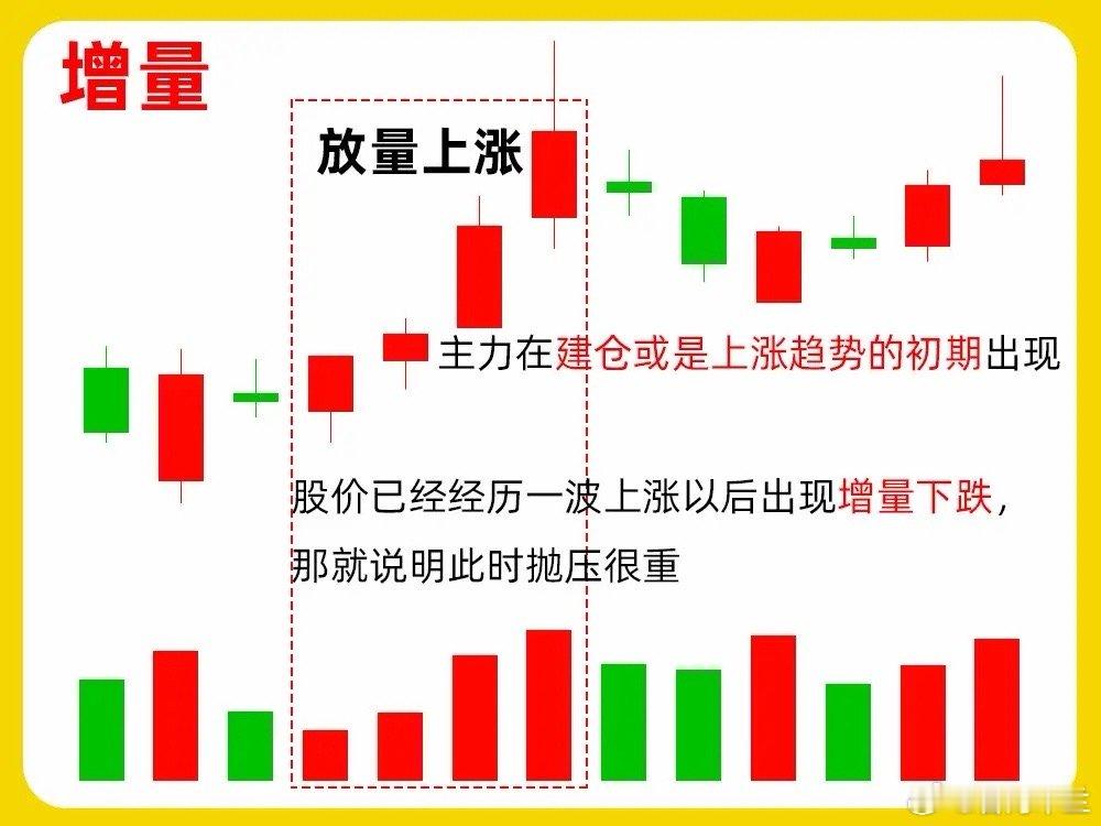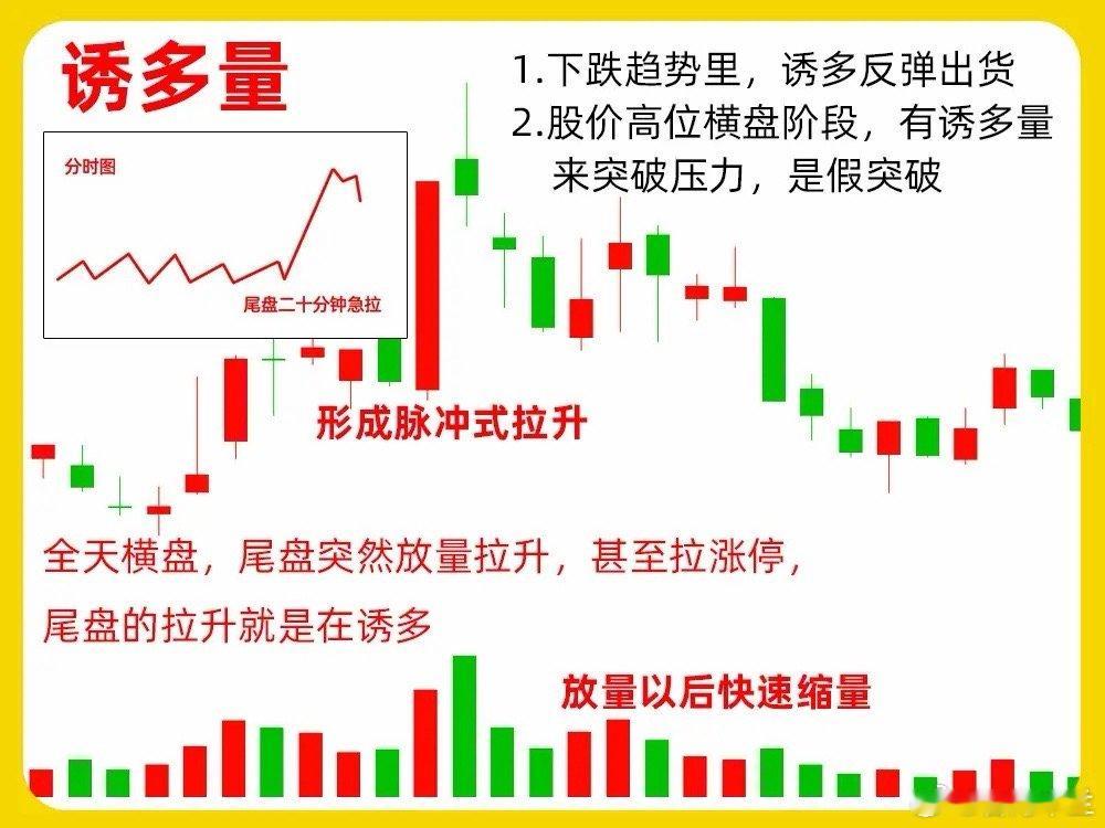 注意了!成交量是短线选手必须知道的一个指标,也是技术分析的基石。但是很有却不知道成交量高价形态都有哪些,今天我一次分享清楚什么是洗盘量、诱多量、增量、换庄量、对倒量、出货量。真正了解成交量核心的东西还是老规矩,点赞收藏或评论888支持一下,我每天分享炒股干货,以免以后想温习找不到了洗盘量主力在建仓以后,股价出现中大阳线以后,股价开始回调,成交量出现缩量,一般会缩减平日成交量的一半,可能出现地量,总体就形成了上涨放量,调整缩量的一个成交量形态,这就是洗盘量,一般会在股票低位盘整或是上涨趋势的初期,出现比较明显诱多量股价经过长时间的上涨以后,主力有一定上涨空间。股价出现天量,虽然此时股价会有继续创了新高,但是没有持续性,往往次日就开始缩量。而且在分时图里,也会出现冲高回落的分时走势。其实这是主力的出货增量这个见的比较多了,股价连续的创新高,而成交量同步放大,就形成我们常说的量价齐升,成交量逐步放大,就增量形态。这种形态一般出现上涨趋势里,有持续的场外资金关注,抛压比较小换庄量股价经过一波上涨以后,出现天量柱,但是后续没有出现缩量回调,而是出现高位横盘,成交量没有明显减少,反而超过前面的天量柱。在K线里,股价还出现连续涨停跌停的情况,往往是个股在换庄对倒量股价经过长时间上涨以后,股价出现放量,而股价并没有出现上涨,反而是出现小阴线小阳线,这时候往往换手率比较高,其实这也是主力出货的表现了出货量成交量会出现放量、缩量、放量,而股价却没有同步上涨,创出新高,就形成一种量价背离的走势。此时我们认真观察,就会发现K线出现上下影线的就比较多,还很长,整个重心在不断下移。这就是成交量高阶形态,不是简单的倍量、凹量这样的形态,下方我们准备了案例图,建议结合起来看。希望对大家有启发,也是最为基础的内容,一定吃透。我们下期内容再见