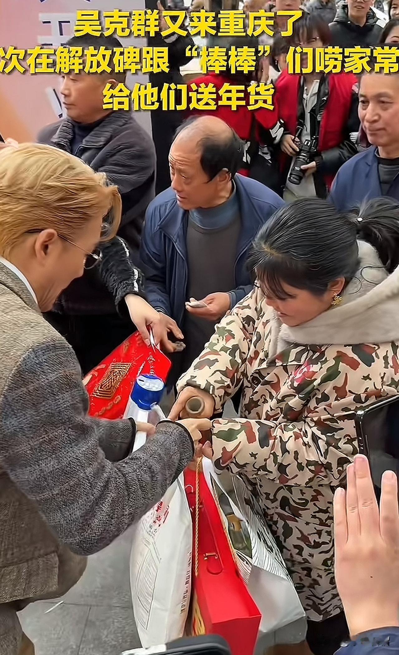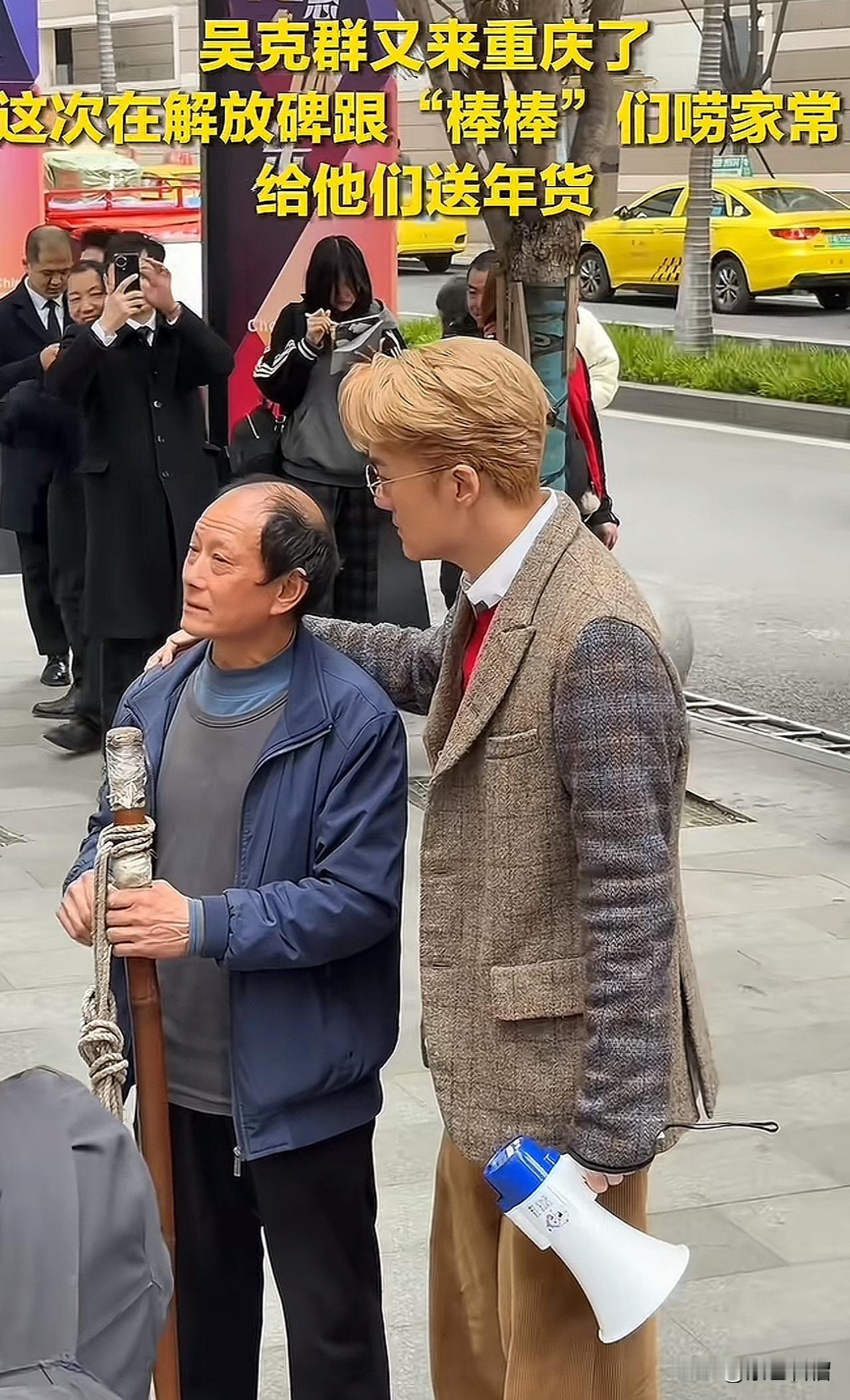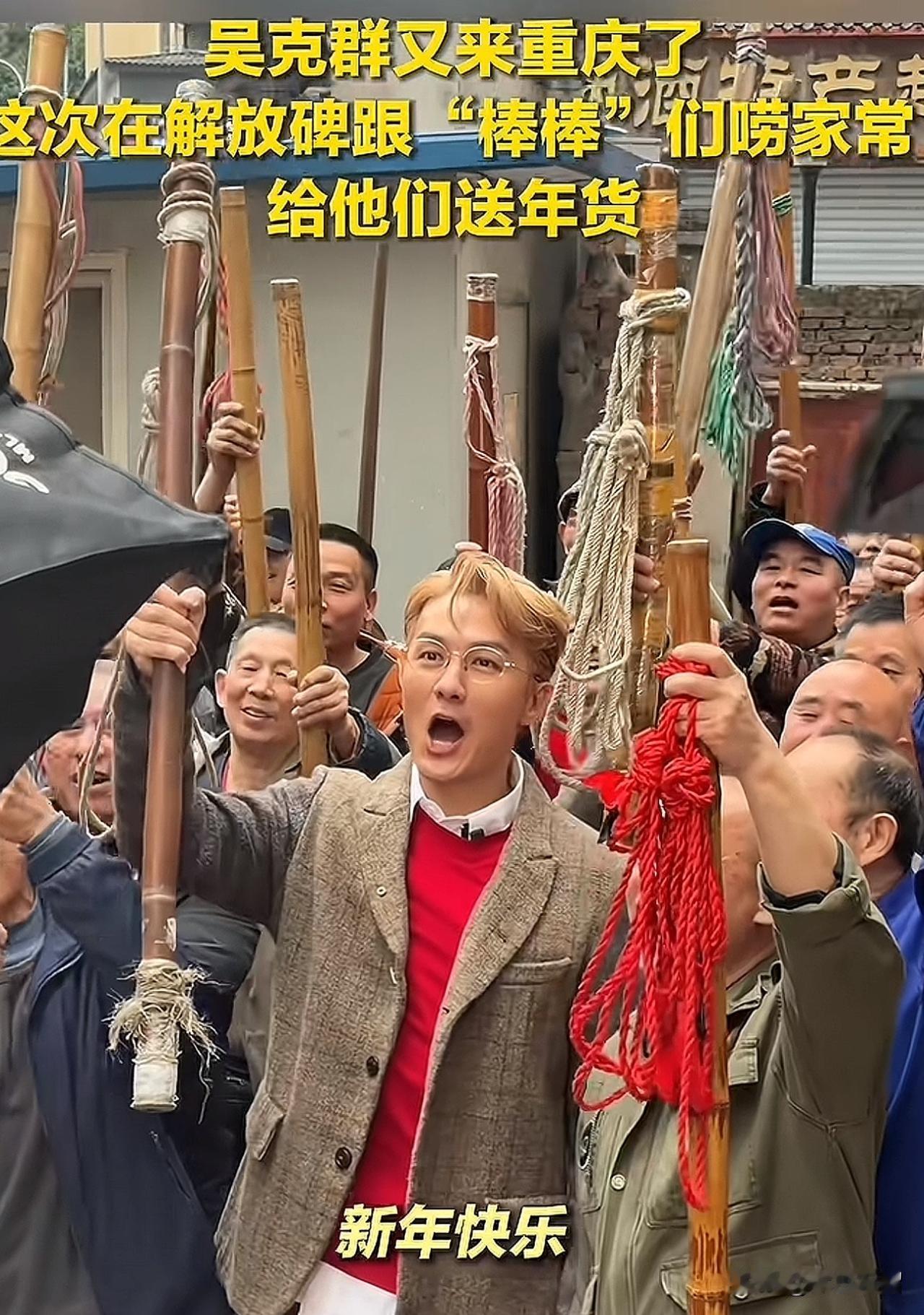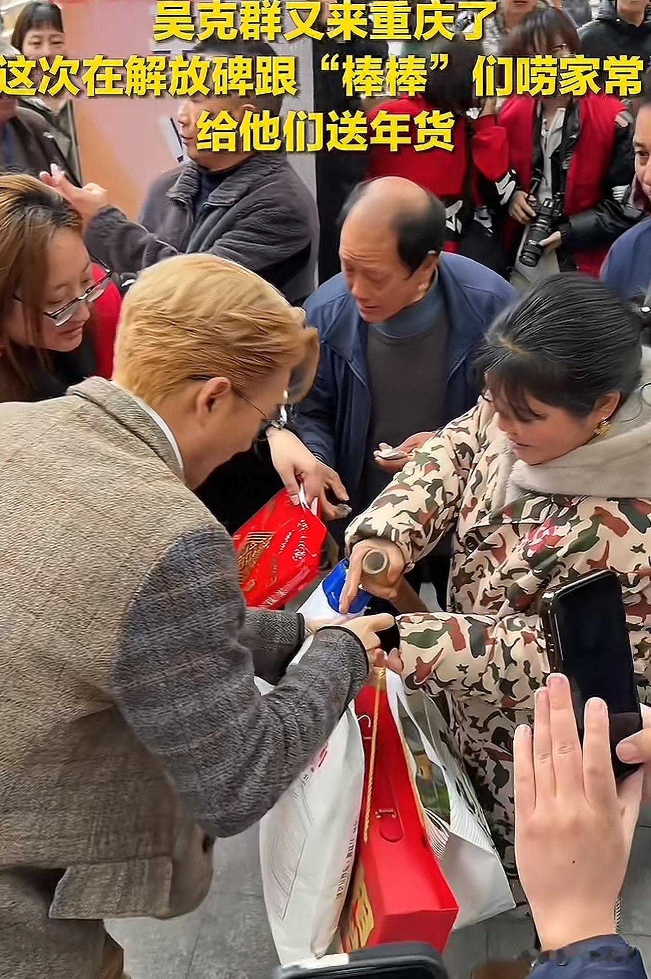 真的被中国台湾歌手吴克群打动了! 2月9日,他再度来到重庆。在重庆解放碑,他与“棒棒”大哥大姐们亲切交谈、闲话家常。他把手搭在棒棒大哥的肩头,宛如和自家亲兄弟聊天;棒棒大哥大姐坐在台阶上,他也跟着坐在他们身旁,与他们近距离交流。用实际行动完美诠释了何为接地气。 他给“棒棒”兄弟们准备的年货有大米、酒等,还给每位棒棒兄弟都备好了红包。 去中国明星很多,但深入群众,为普通老百姓站台的却很少,吴克群就是其中一位。为这位接地气、时刻心系一线劳动者的明星点赞! (图片来源网络)