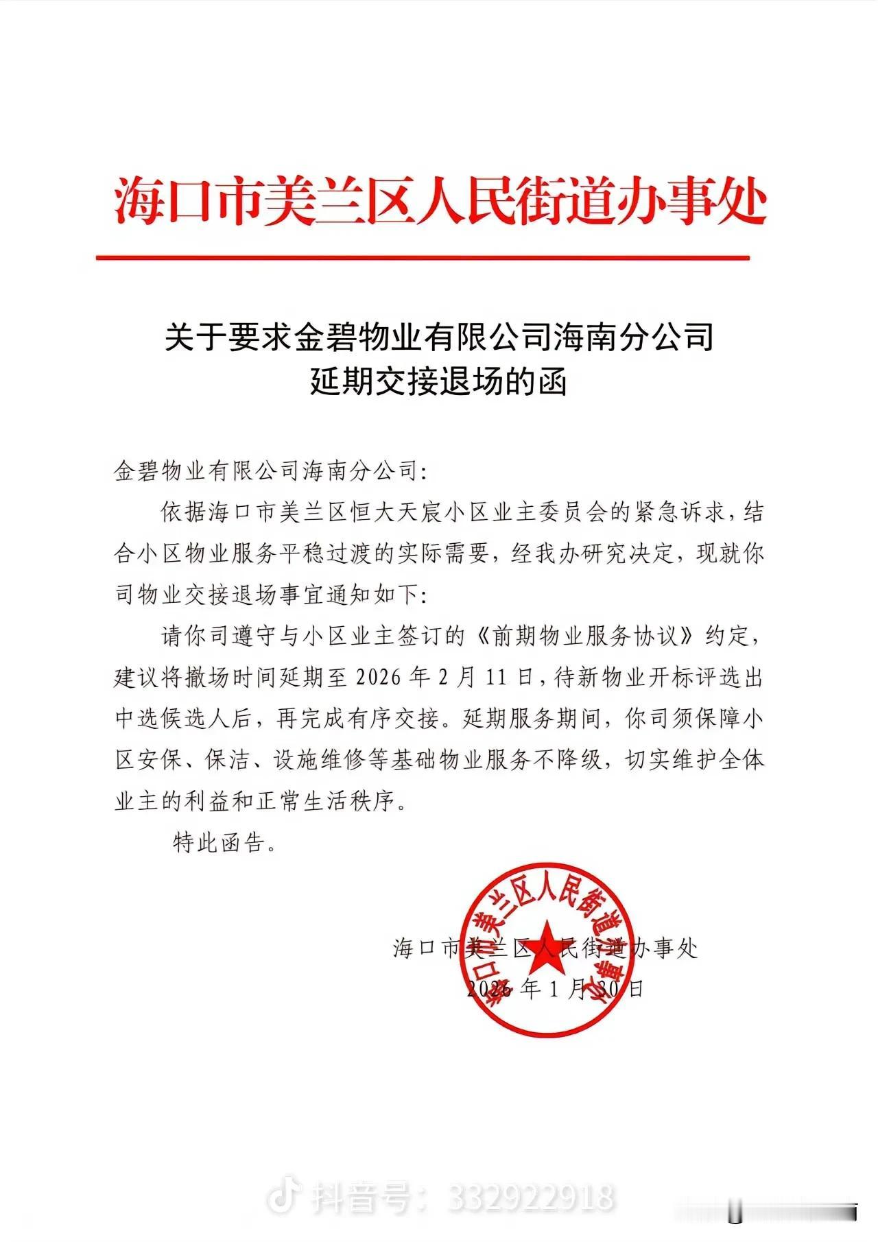 2月8日是金碧物业撤场退出海口美丽沙天宸小区的日子,如笔者猜测不出所料,天宸小区还是有些太仓促了,没准备好。 街道办出手要求金碧退期几天,等小区开标选出新公司完成交接后再撤场。金碧能同意,也算是仁至义尽。 就算12号新物业接手,临近过年了,各项工作交接能否顺利,这个春节能否过好,还是个问题? 开弓没有回头箭,不管怎样,还是希望新物业能顺利进小区履行服务,也感谢天宸小区业委会的付出和努力,希望该小区能在美丽沙片区闯出一片新天地,为其他十几个小区做表率,起到示范作用。