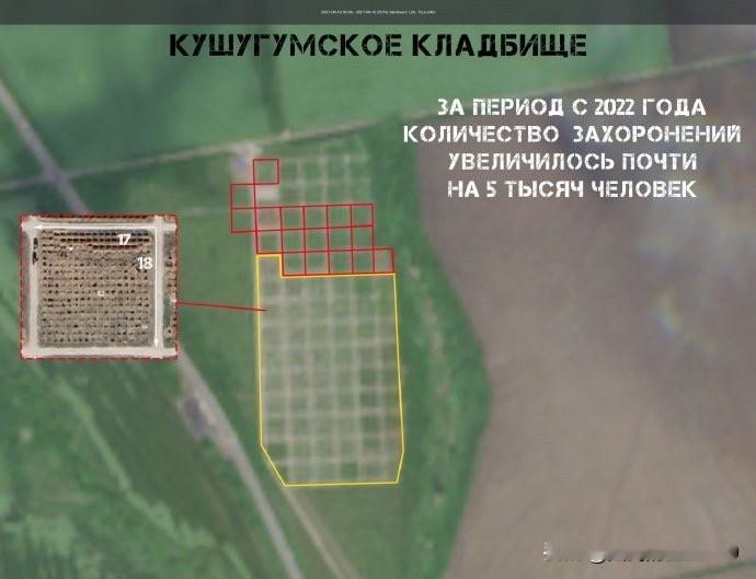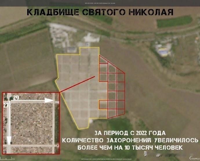 俄罗斯通过卫星分析了乌克兰扎波罗热州乌军控制区内的四座公共墓地的变化。 四块墓地包括:库舒古姆斯科公墓,马特维耶夫斯科耶公墓,圣尼古拉斯公墓 ,右岸公墓 通过分析并计算,结果是,自2022年至2025年,仅仅在上述的四座墓地,就新增墓碑超过3万个,其中绝大多数的坟墓,是阵亡的乌军士兵。