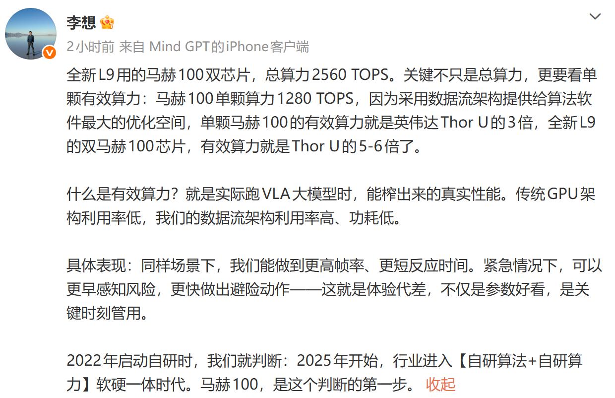 一颗顶三颗,最强国产自研智驾芯片即将亮相! 即将上市的全新理想L9 Livis将搭载两颗自研芯片,2560 TOPS算力。这是目前国内最强的智驾算力配置。 并且单颗1280 TOPS算力就可以等效三颗英伟达Thor U芯片,两颗2500T+的算力,两年内应该是足够用了,即便是应对L3/L4也问题不大 相对当前的配置,整个系统的性能应该会提升不少,再等三个月左右就可以看到实际效果了。