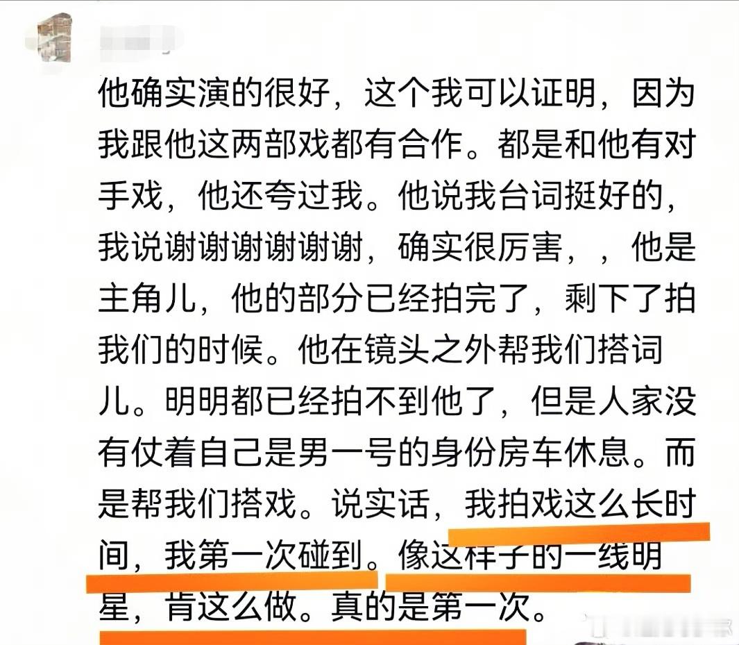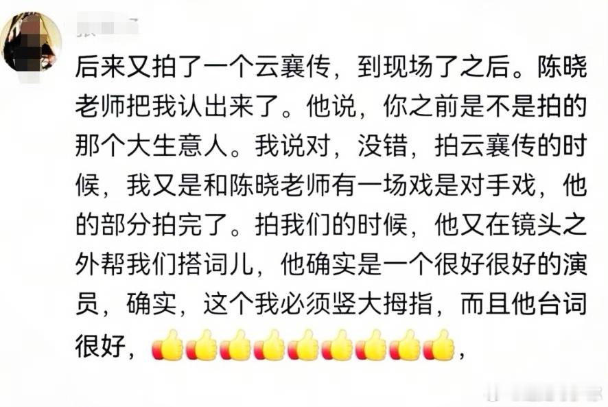 陈晓老师确实是一个非常非常,敬业的老师,他的部分拍完之后,拍我们的时候,他完全可以去休息,但是他没有。他还在那里帮我们搭词儿,这个很牛逼很牛逼,他确实演的很好,这个我可以证明,因为我跟他这两部戏都有合作,都是和他有对手戏,他还夸过我。确实很厉害,他是主角儿,明明都已经拍不到他了,但是人家没有仗着自己是男一号的身份房车休息。而是帮我们搭戏。说实话,我拍戏这么长时间,我第一次碰到。像这样子的一线明星,肯这么做。真的是第一次,他确实是一个很好很好的演员,这个我必须竖大拇指,而且他台词很好