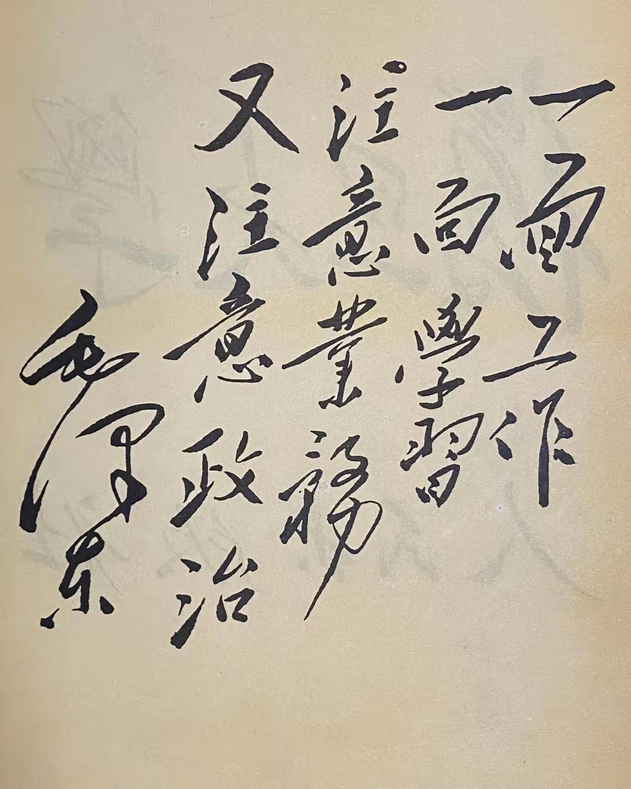 毛主席给某个人的勉励题词!今天我们看到的这副题词:一面工作,一面学习,注意业务,又注意政治!从“毛泽东”落款的三个字来看,这个勉励题字,应该是题于上世纪五十年代。毛主席的书法,很有力度,简直就是刀辟斧砍,看着就很过瘾!