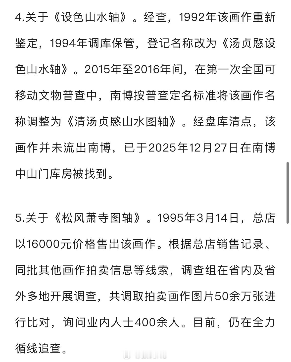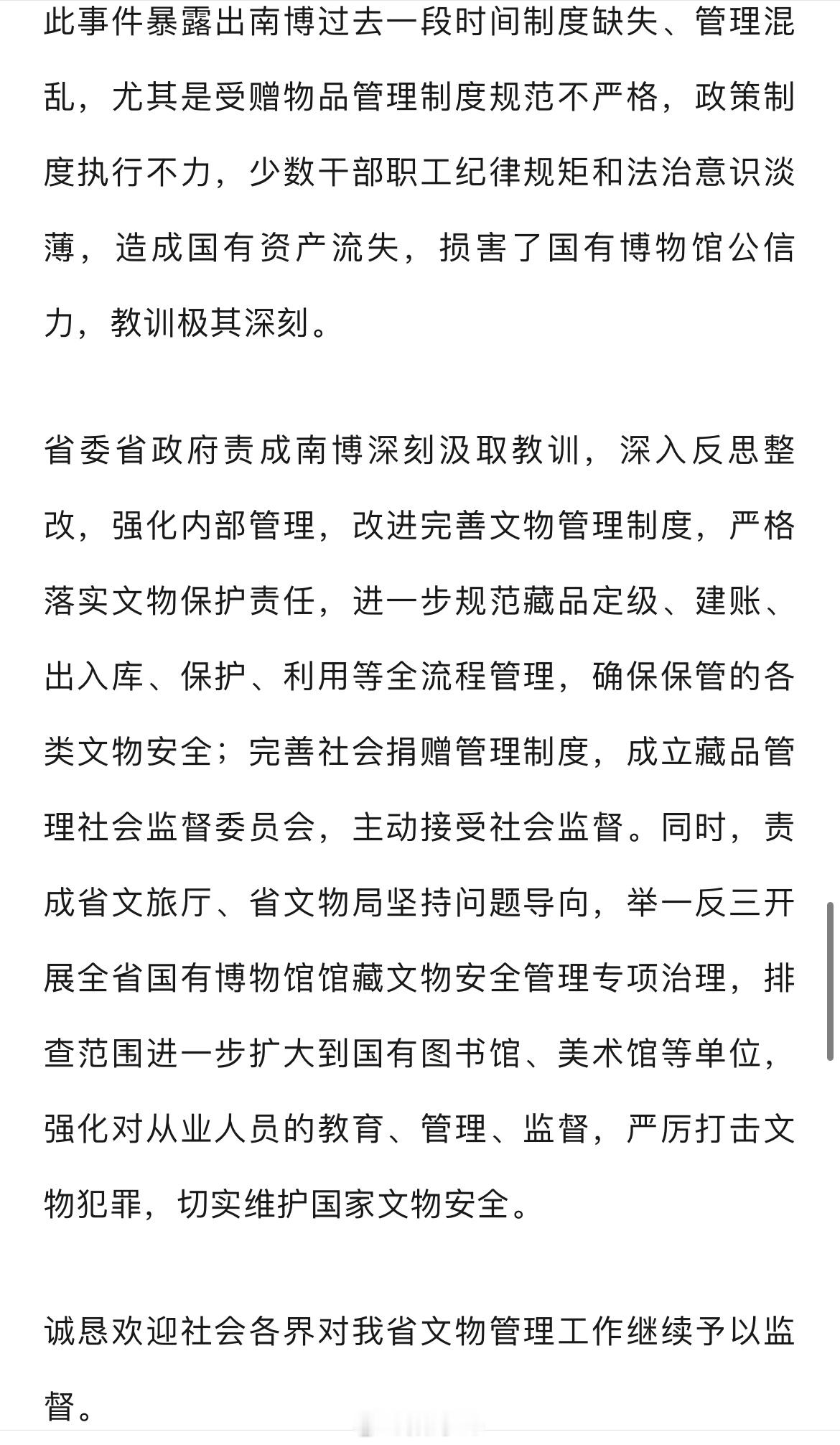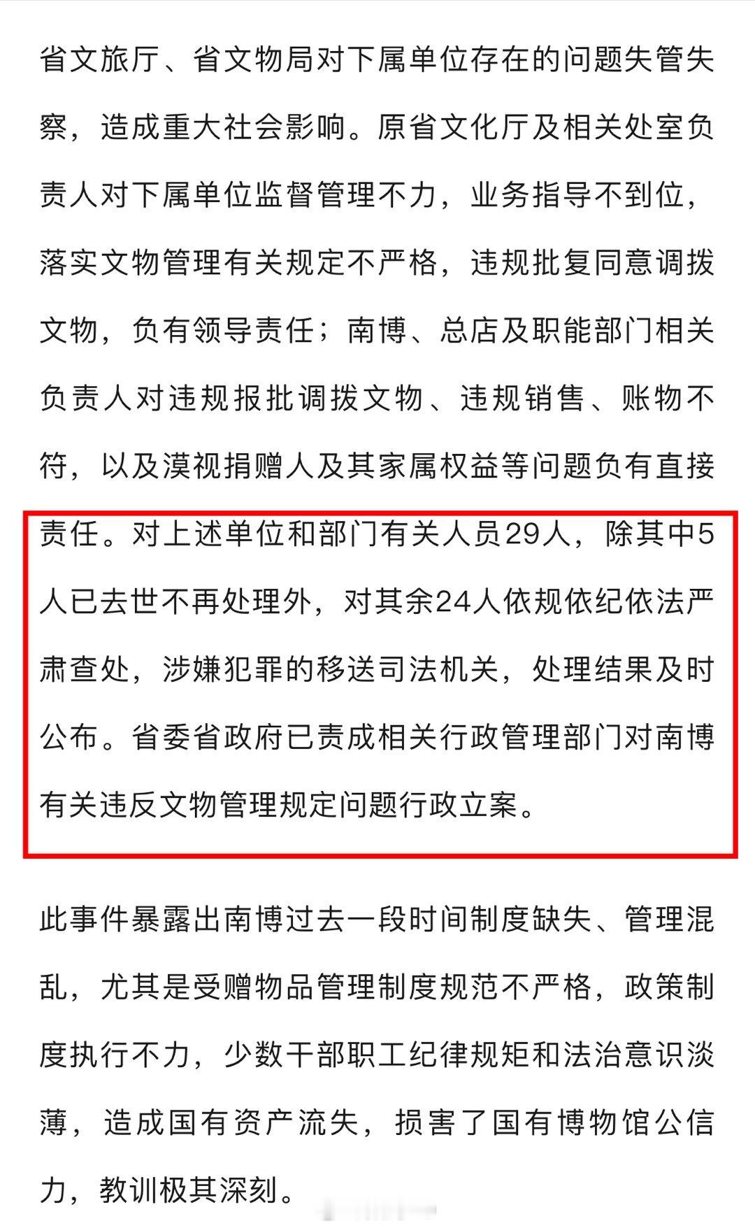 南京博物院事件最新通报南京博物院事件最新通报,徐湖平在担任南博及总店相关负责人期间,违规调拨、销售馆藏文物,对内部管理混乱问题失管失察,涉嫌严重职务违法,正接受审查调查。南博员工张某利用职务便利私自买卖文物。省文旅厅等部门监管不力,29名相关人员中24人被严肃查处,南博被行政立案。